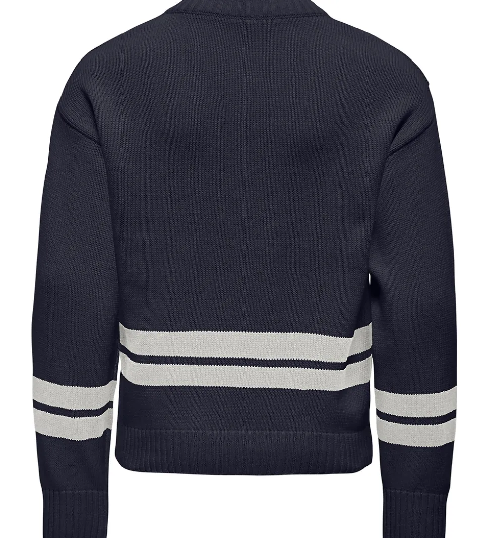 Smart Kids Only bluse i navyblå strik med to hvide striber og en applikation af et bjørnehoved og et 2-tal i hvidt frotté. Blusen har lange ærmer og en klassisk V-hals, der giver et stilrent udtryk. Blusen har ribkanter langs alle åbninger.