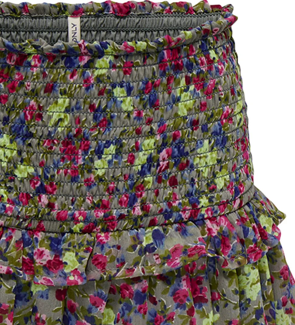 Skøn Kids Only nederdel i grå med et alloverprint af blomster i grønne, blå og rosa nuancer.
