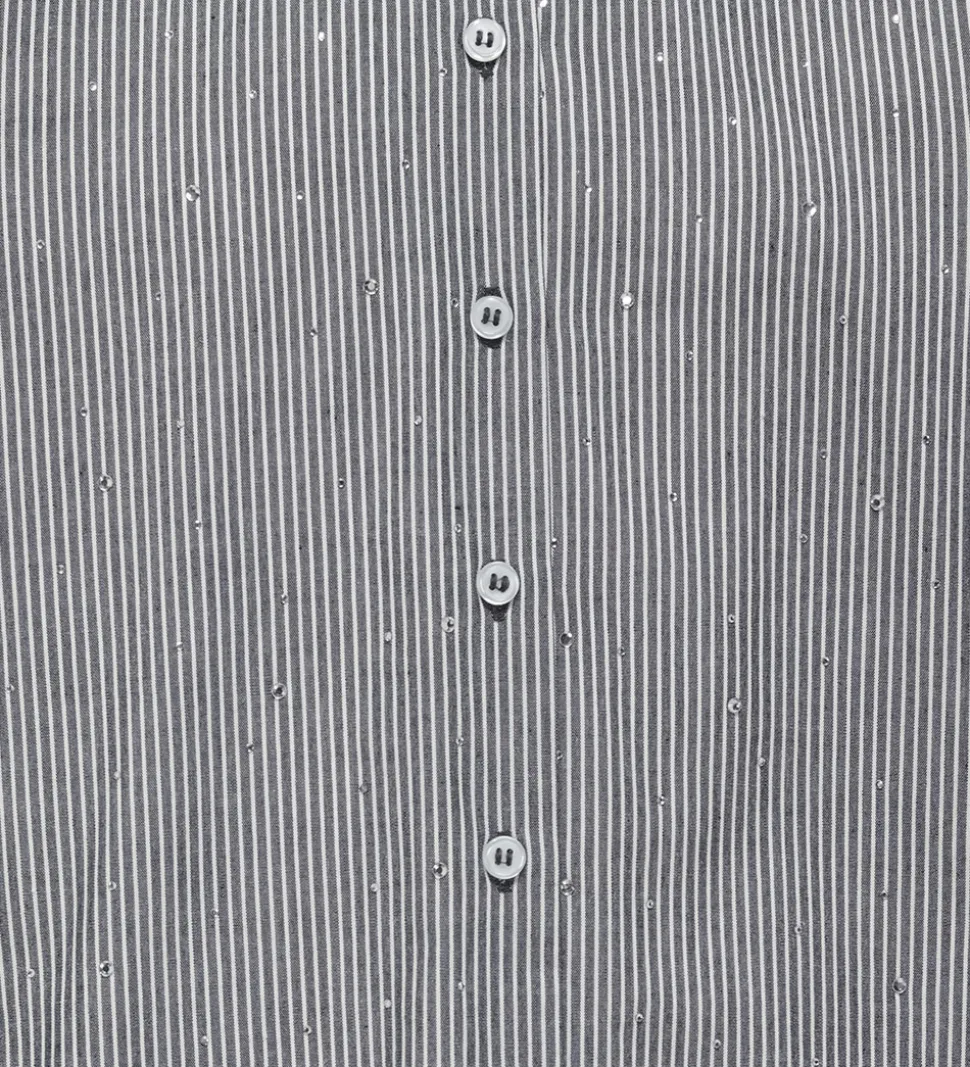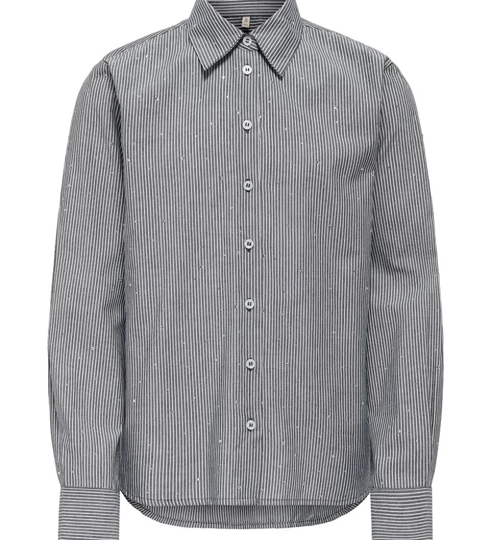Stilfuld Kids Only skjorte stribet mørkeblå og hvid med små similisten i sølv på fronten og på ærmerne. Skjorten har en klassisk krave og gennemgående knapper fortil. Den har lange ærmer med manchetknapper ved håndleddende og i bunden er den længere bagtil.