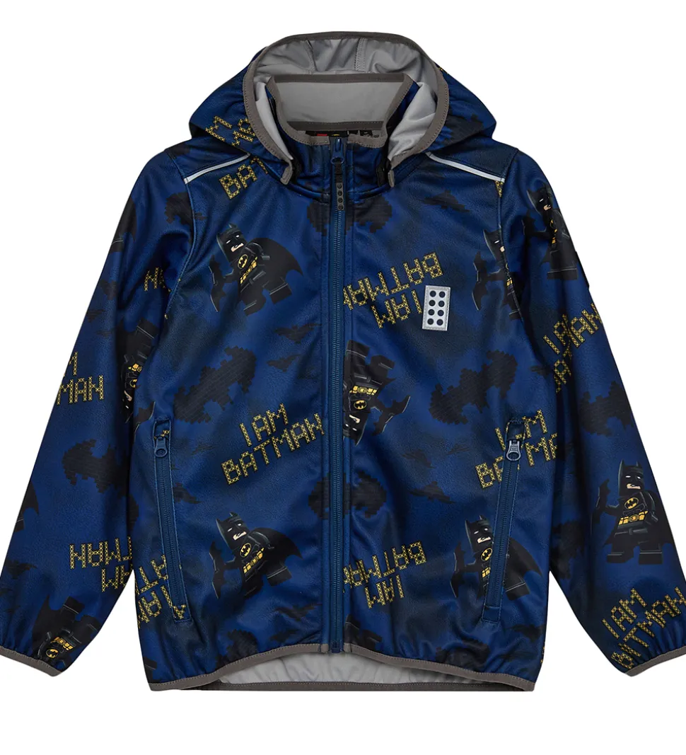 Sej LEGO® Batman softshelljakke i mørkeblå med et print i sort og gul med Batman samt teksten “I Am Batman” i gul.
