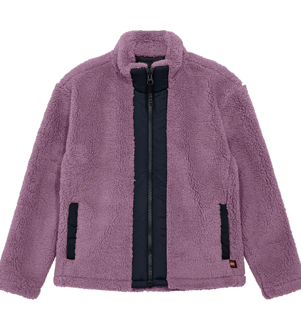 Lækker LEGO® Wear fleecejakke af lilla teddyfleece med indsatser i et navyblåt, glatvævet materiale.