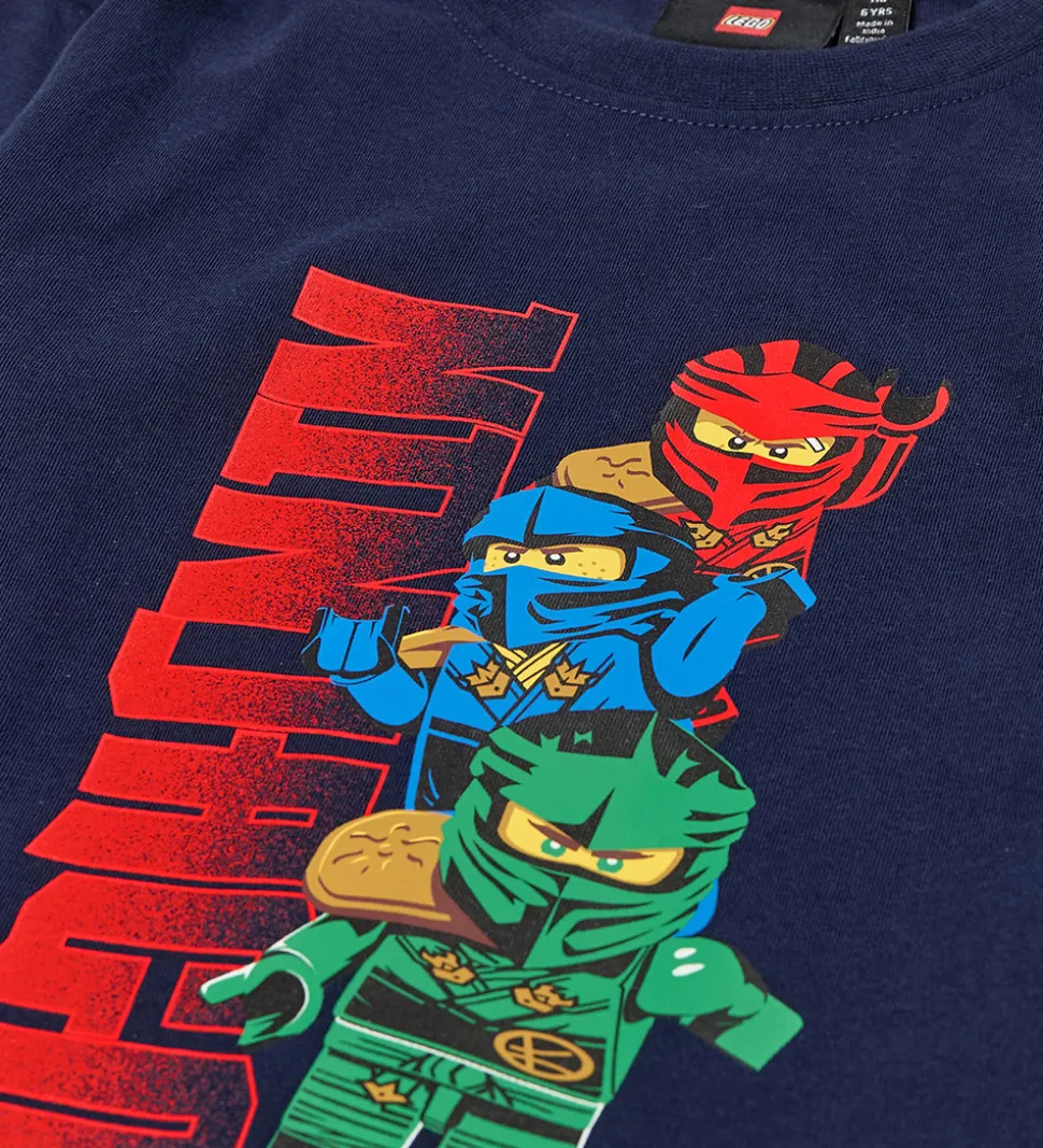 Smart LEGO® Wear Ninjago bluse solgt i en 2-pak med én i mørkeblå og én i rød. Fortil prydes bluserne af et stort og farverigt print med LEGO® Ninjago-figurer.