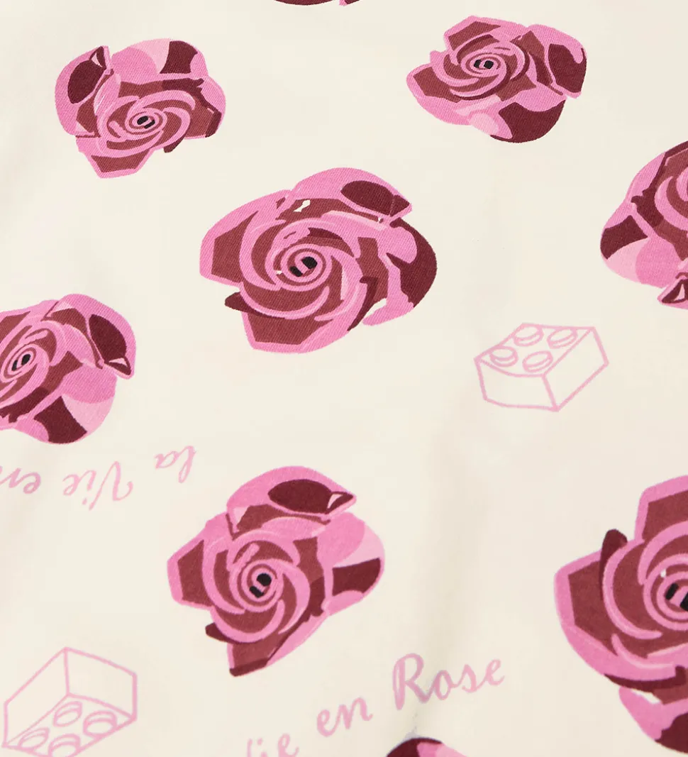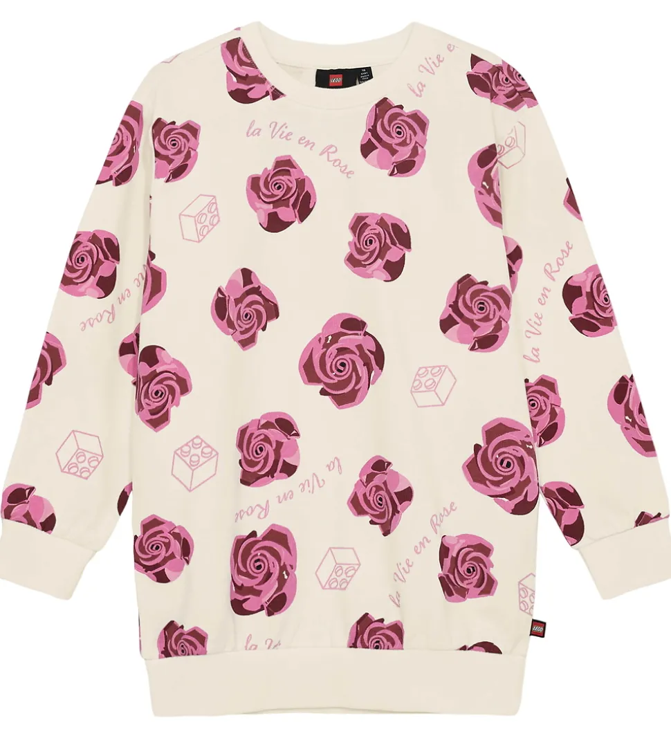 Skøn LEGO® Wear sweatkjole i råhvid med et allover print af pink roser, LEGO® klodser samt teksten “la Vie en Rose”. Indersiden er i blød, børstet bomuld.