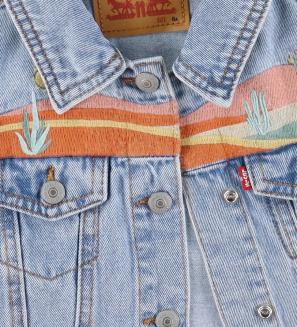 Smart Levis vest i lys denim med dekorative broderede detaljer af et ørkenlandskab.