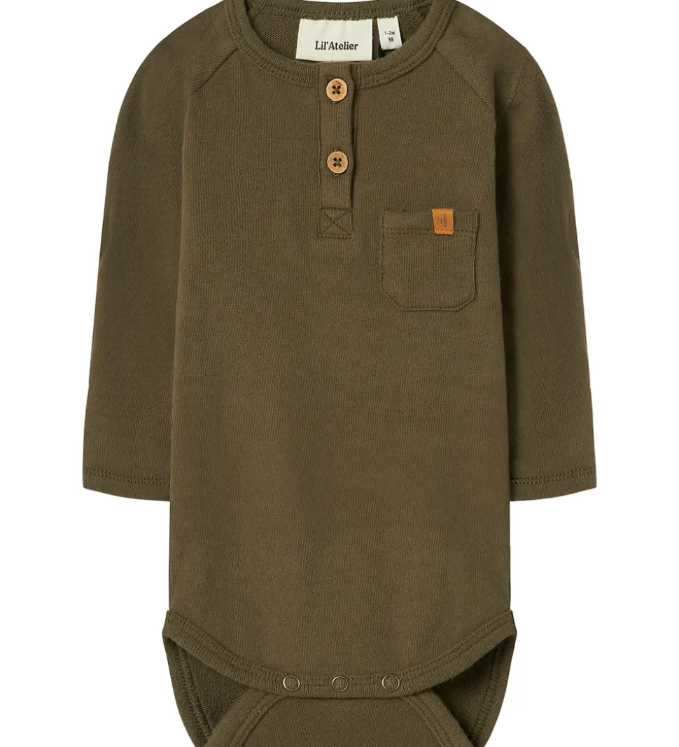 Elegant Lil’ Atelier body i en dyb olivengrøn farve og med en flot ribstruktur. Bodyen har lange ærmer og en blød struktur, der giver et klassisk look. På forsiden pryder en lille brystlomme med en diskret mærkedetalje. Lukningen består af to praktiske knapper foran, og mellem benene er der trykknapper.