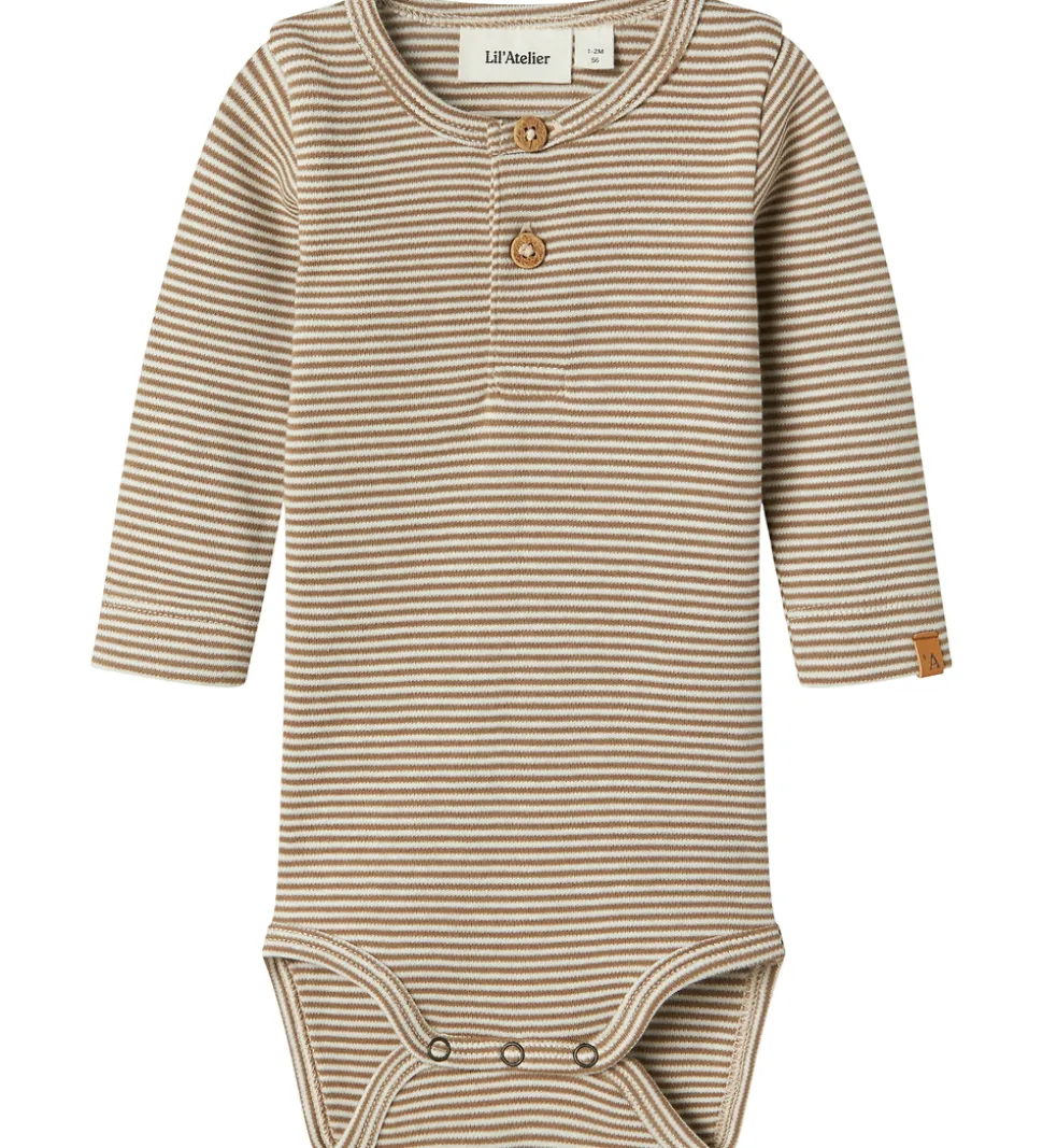 Elegant Lil’ Atelier body med lange ærmer og et klassisk stribet mønster i beige og hvid. Bodyen er designet med en rund halsudskæring og lukkes med tre praktiske trykknapper i bunden. Ærmerne og kanten forneden har bløde afslutninger, der sikrer en komfortabel pasform. Bodyen åbnes fortil med knapper, som giver et stilfuldt udtryk.