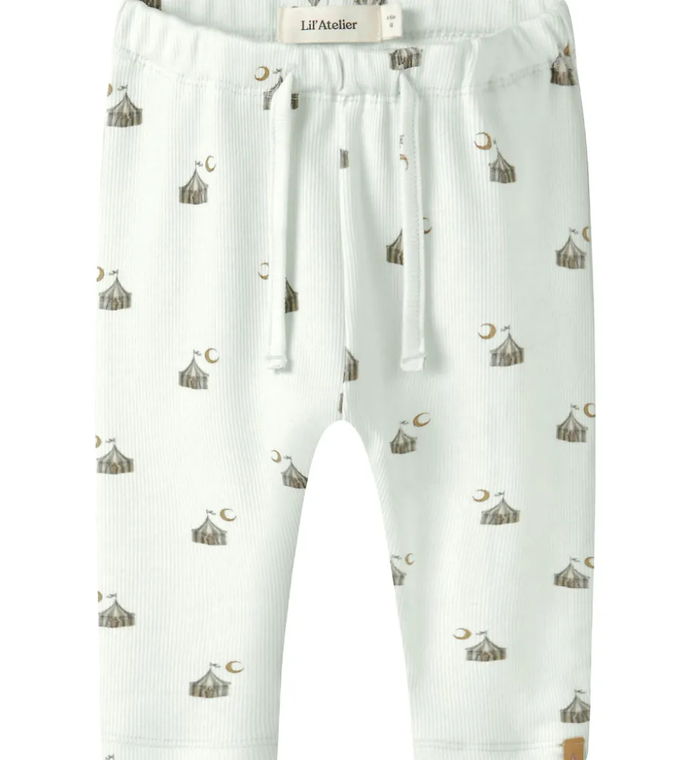Fine bukser fra Lil’ Atelier i en lys mintgrøn med et charmerende allover telt- og måneprint. Lil Atelier bukserne er designet med en elastisk talje samt dekorative snøre, som sikrer en justerbar pasform. Stoffet har en fin ribstruktur, og buksebenene har afslappede kanter, der giver et neutralt udtryk.