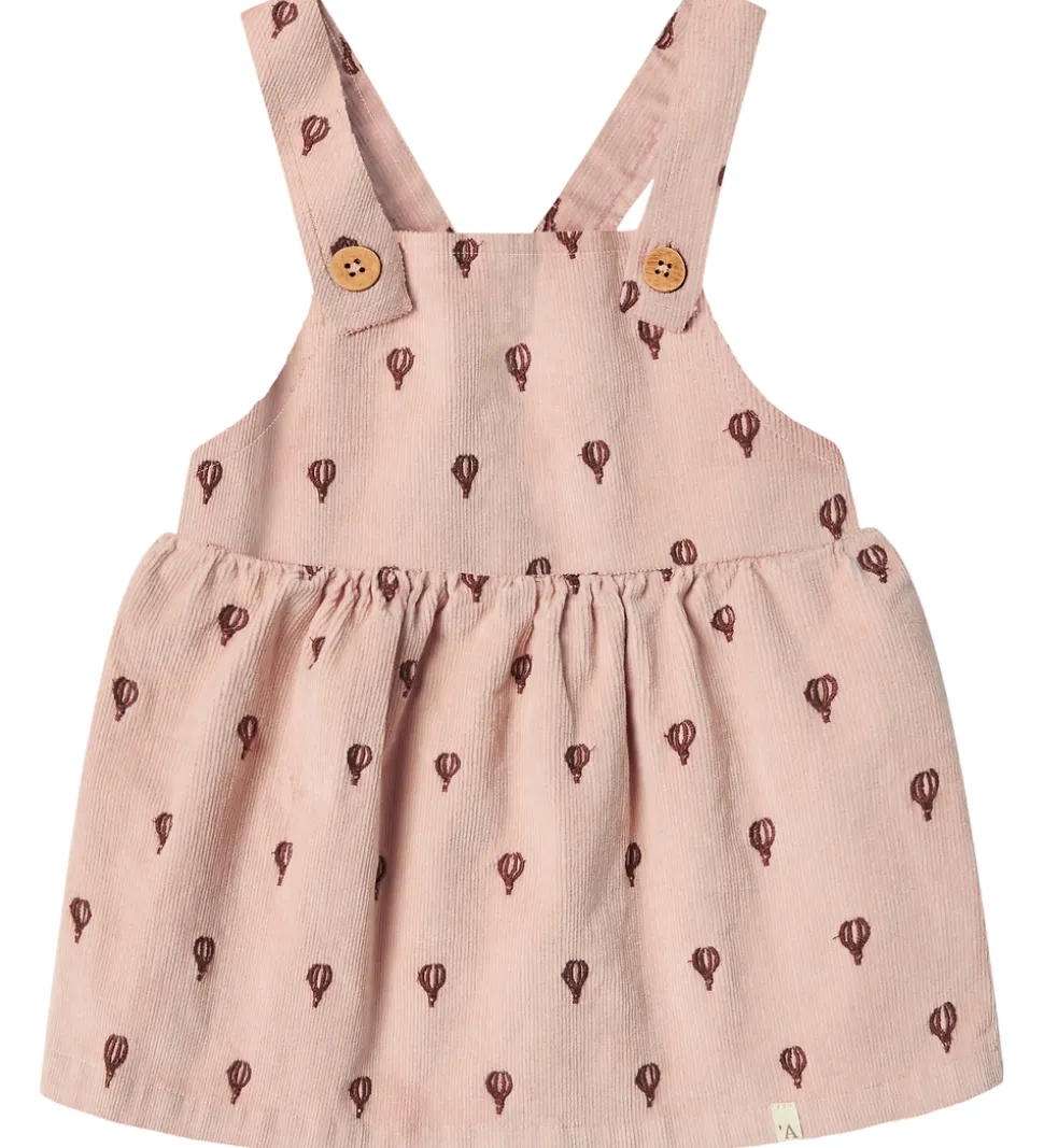 Elegant Lil Atelier kjole i rosa fløjl med et alloverprint af broderede luftballoner i mørkerød. Lil Atelier kjolen har smalle skulderstropper, som knappes fortil. I ryggen er der en elastik, som gør det nemt at få kjolen af og på. Fortil er der en lille lomme.