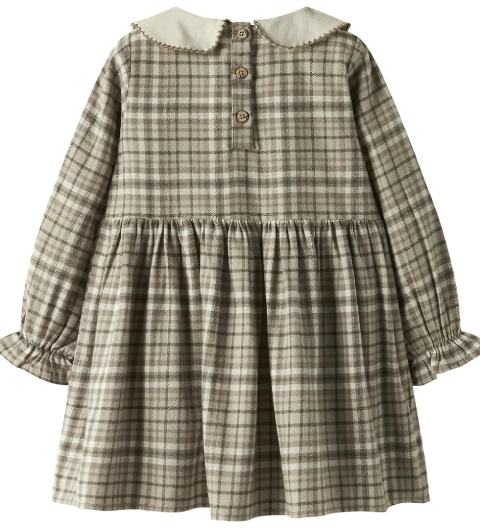 Elegant kjole fra Lil Atelier i beige med ternet mønster i brune nuancer. Lil Atelier kjolen har lange ærmer med flæser ved håndleddene og en dekorativ krave i råhvid med broderede blomsterdetaljer. Kjolen er skåret ved taljen, og har en let børstet overflade, som gør den meget blød.
