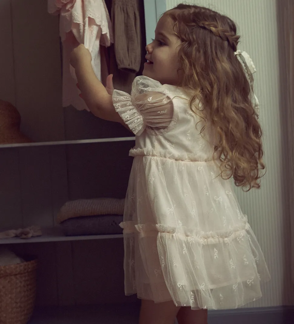 Elegant Lil Atelier kjole i lys rosa tyl med broderede sløjfer. Kjolen har en rund halsudskæring med knapper i nakken. Den har korte pufærmer med flæseafslutning. Kjolen er skåret ved taljen, og på skørtet er der to flæsedetaljer. Kjolen består af et lag økologisk bomuld inderst og to lag tyl yderst.