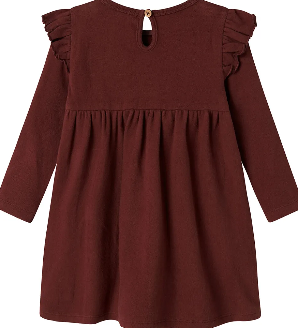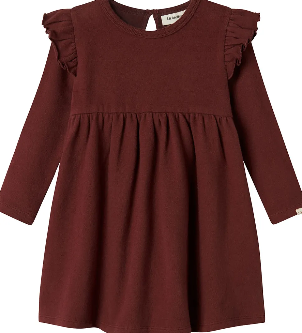 Flot Lil Atelier kjole i vinrød i fin strikket kvalitet. Lil Atelier kjolen har en rund halsudskæring med en knap i nakken. Den har lange ærmer og fine flæsedetaljer ved skuldrene. Under brystet er der en syning, som giver skørtet et let fald.