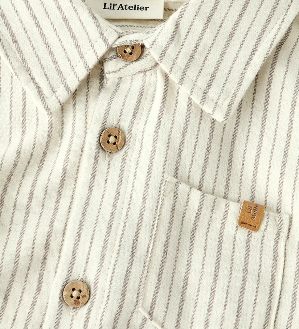 Charmerende Lil Atelier skjorte i beige med lange ærmer og klassiske striber i lysebrun. Skjorten har en traditionel krave og knaplukning foran, samt en enkelt brystlomme, der tilføjer et pænt element til designet.