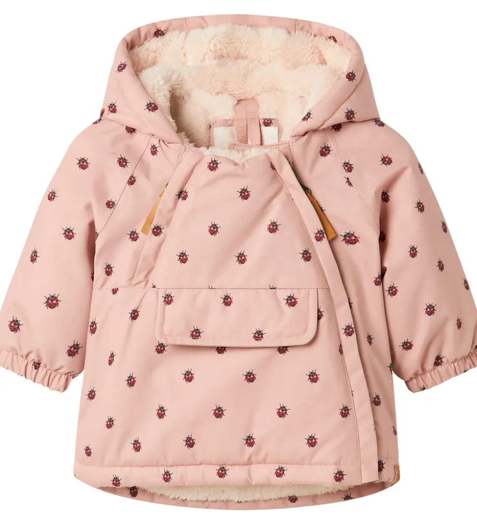 Sød Lil Atelier vinterjakke i en støvet rosa med mariehøneprint og med en fin klaplomme på maven.