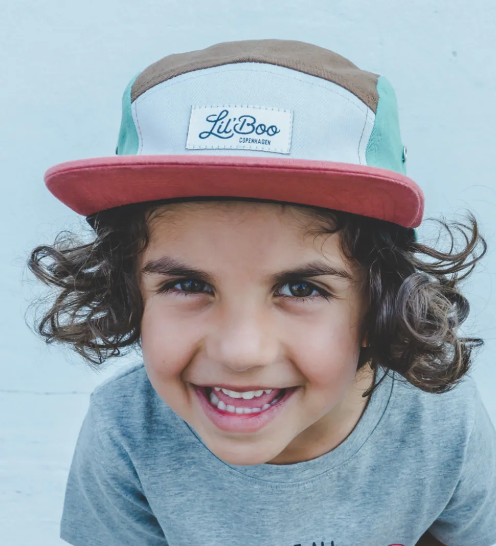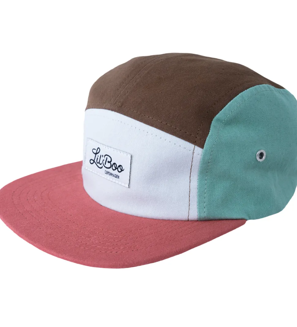 Dejlig Lil’ Boo kasket med flotte blokfarver i grøn, brun og lysegrå, samt en rustrød skygge. Fortil er der en fin logoapplikation.