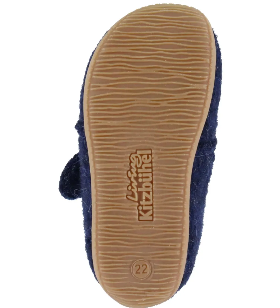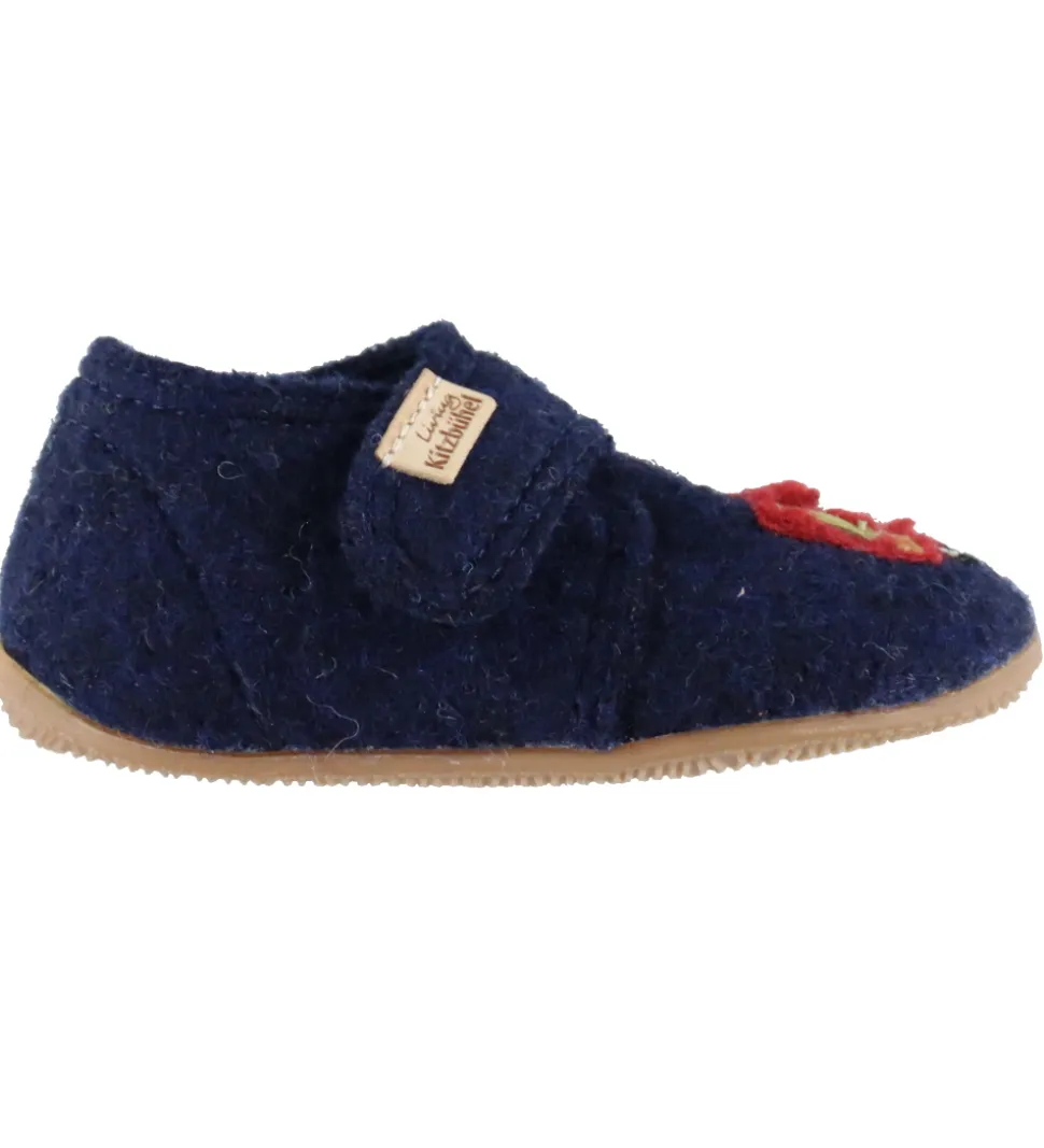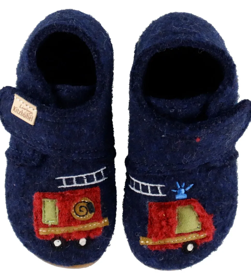 Skønne Living Kitzbühel hjemmesko i mørkeblåt uld med en brandbilsapplikation på begge fødder.
