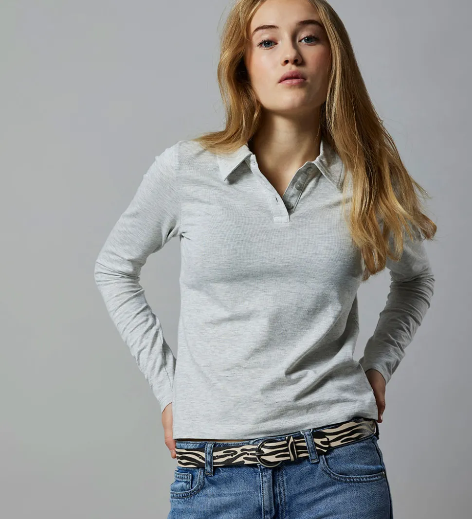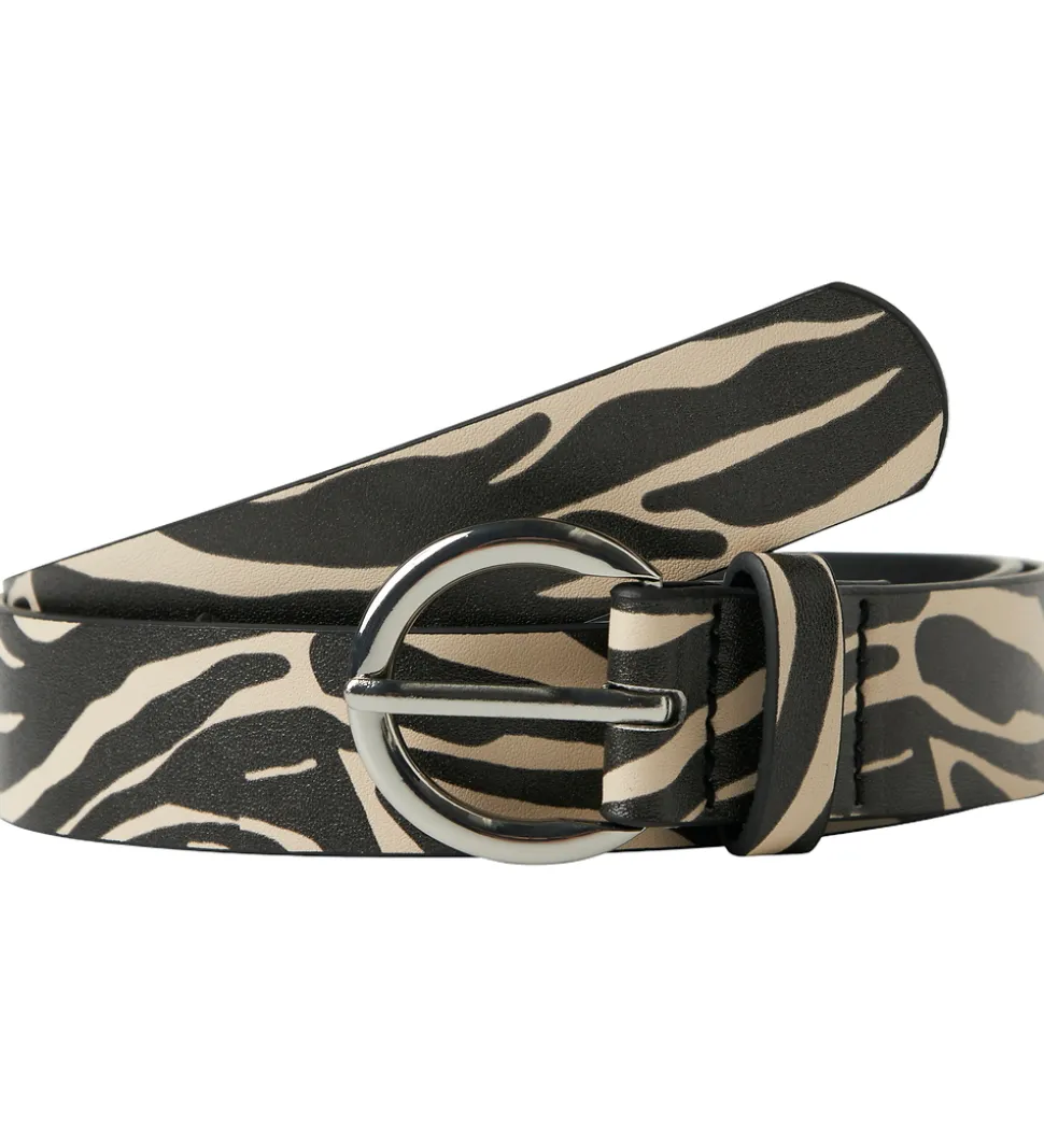Flot LMTD bælte med zebralignende striber i sort og beige. Bæltet har en glat tekstur og et stilfuldt, sølvfarvet rundt spænde, der skaber et moderne udtryk. LMTD bæltet fremstår som en iøjnefaldende detalje med sit unikke design.