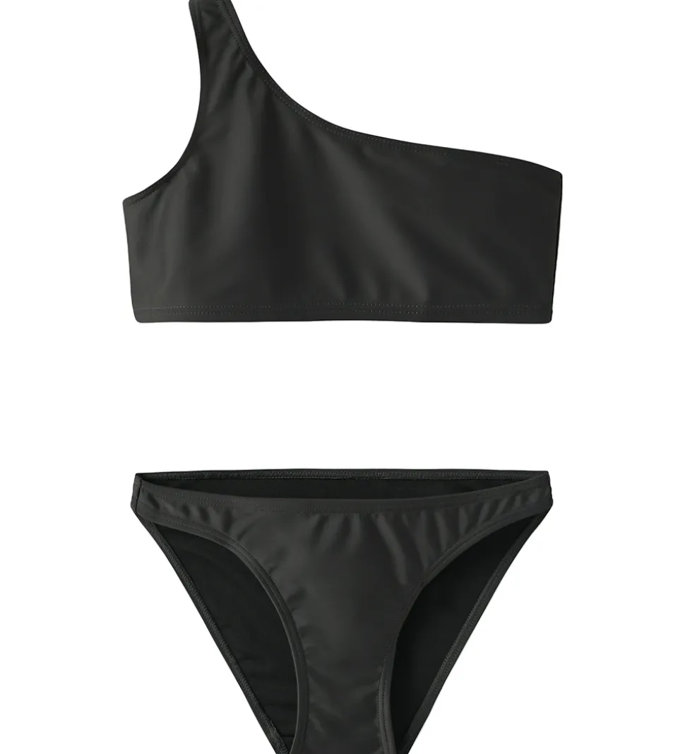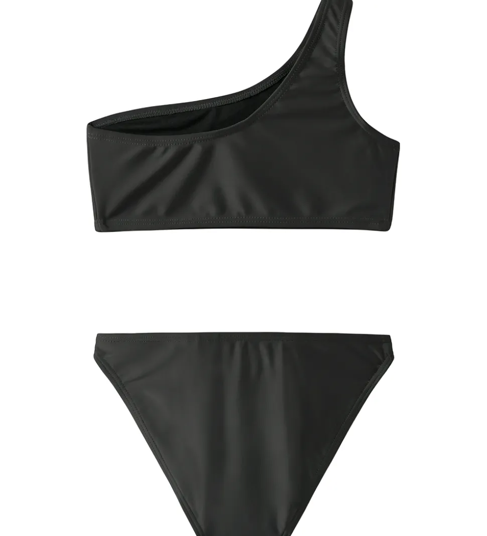 LMTD bikinioverdelen har et asymmetrisk design med en bred strop på den ene skulder. Bikinibunden har en smal elastikkant i taljen, der giver en god pasform.