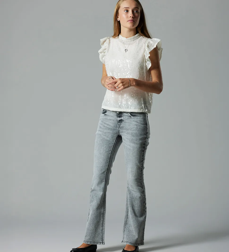 Elegant LMTD bluse i hvid med broderidetaljer og transparente palietter. Blusen har en rund halsudskæring med en knap i nakken. Den har korte flæseærmer og en løs pasform.