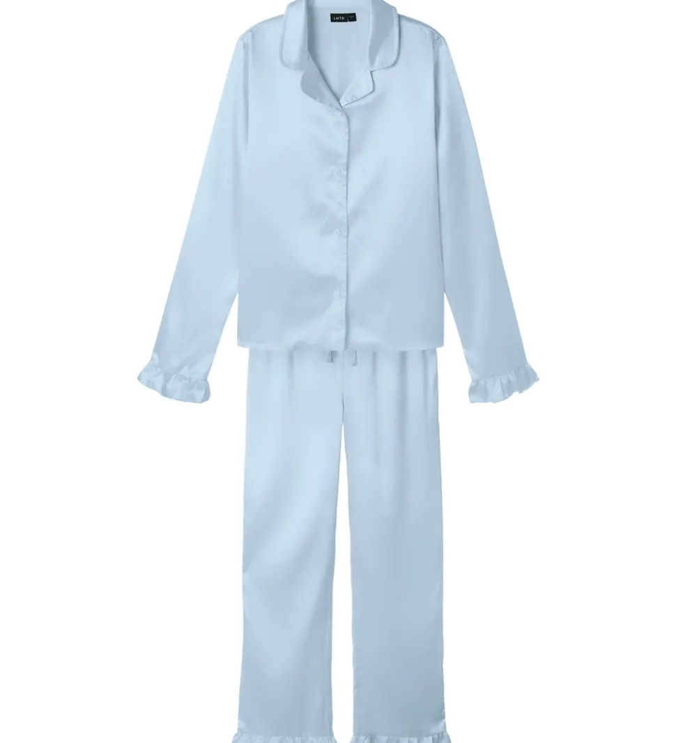 Elegant LMTD nattøj bestående af en natskjorte og et par natbukser i blå satin. Natskjorten har en skjortekrave og gennemgående knapper fortil. I ærmeåbningerne er der fine flæsedetaljer. Natbukserne har en bred elastik i taljen, som kan justeres med snører fortil. I benåbningerne er der flæseafslutning. Nattøjet er fremstillet i en blød og let kvalitet.