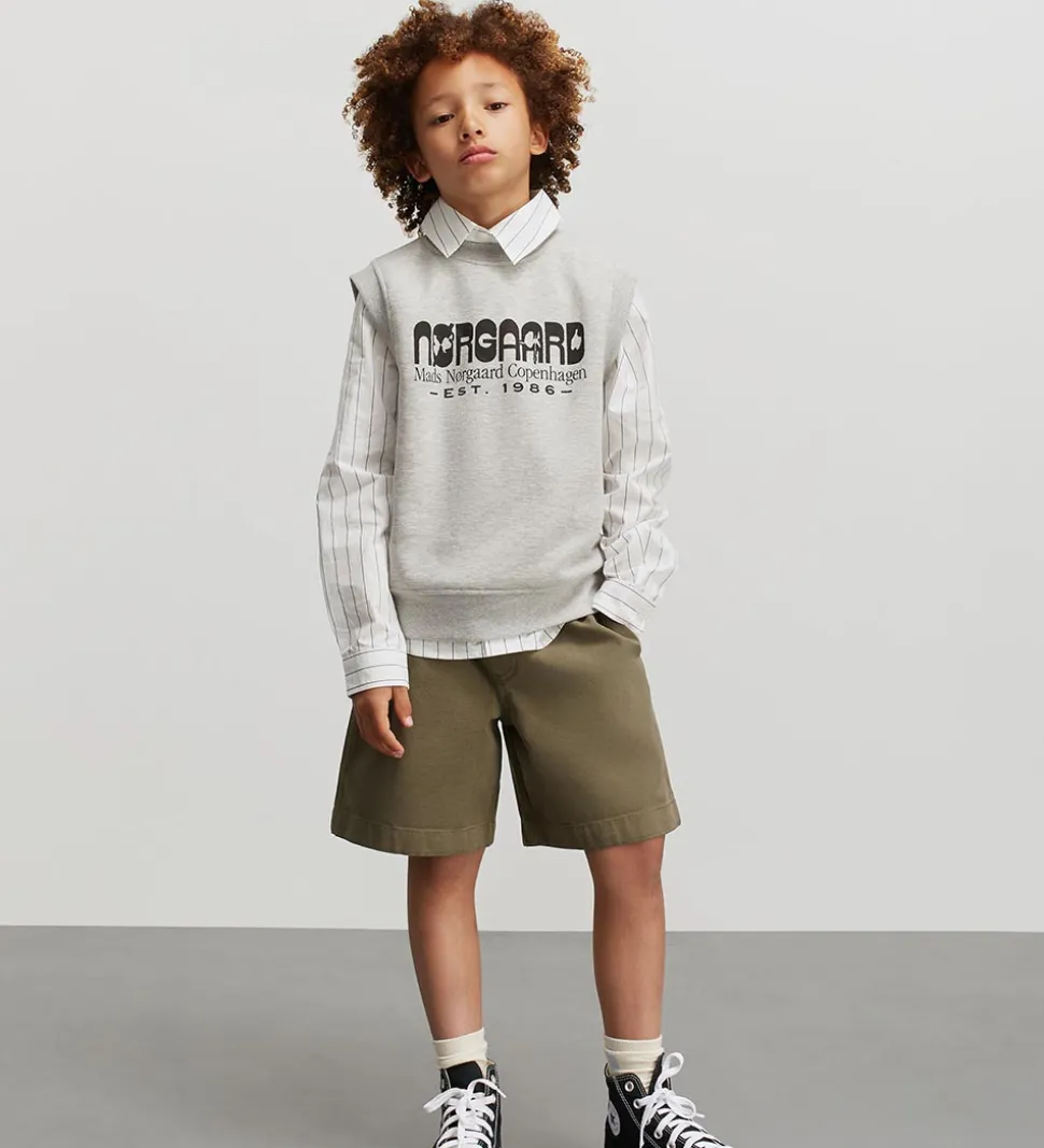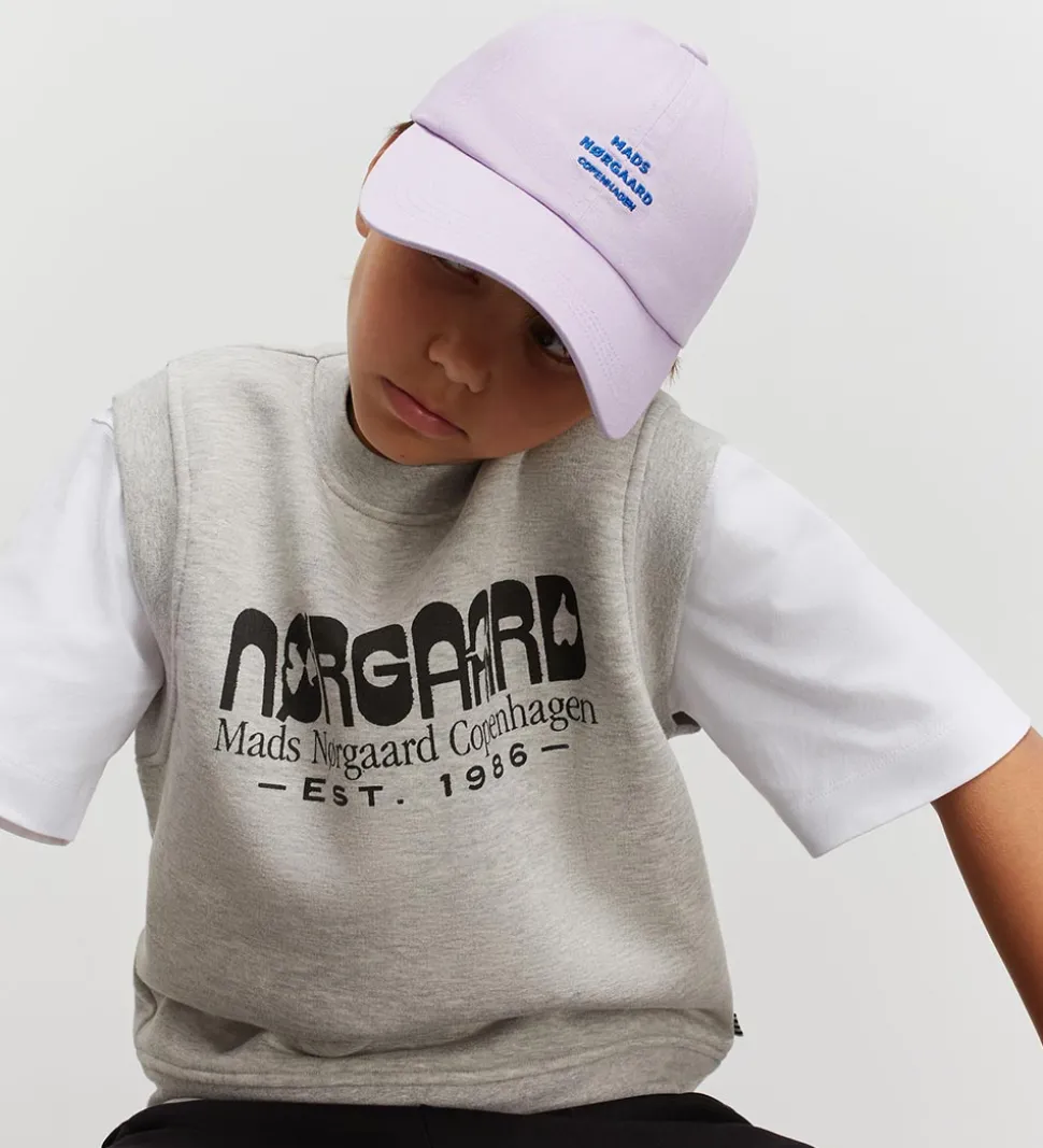 Lækker Mads Nørgaard vest i en lysegråmeleret farve med et stort logoprint på fronten i sort. Vesten har korte ærmer og en afslappet pasform, ideel til en casual dag.