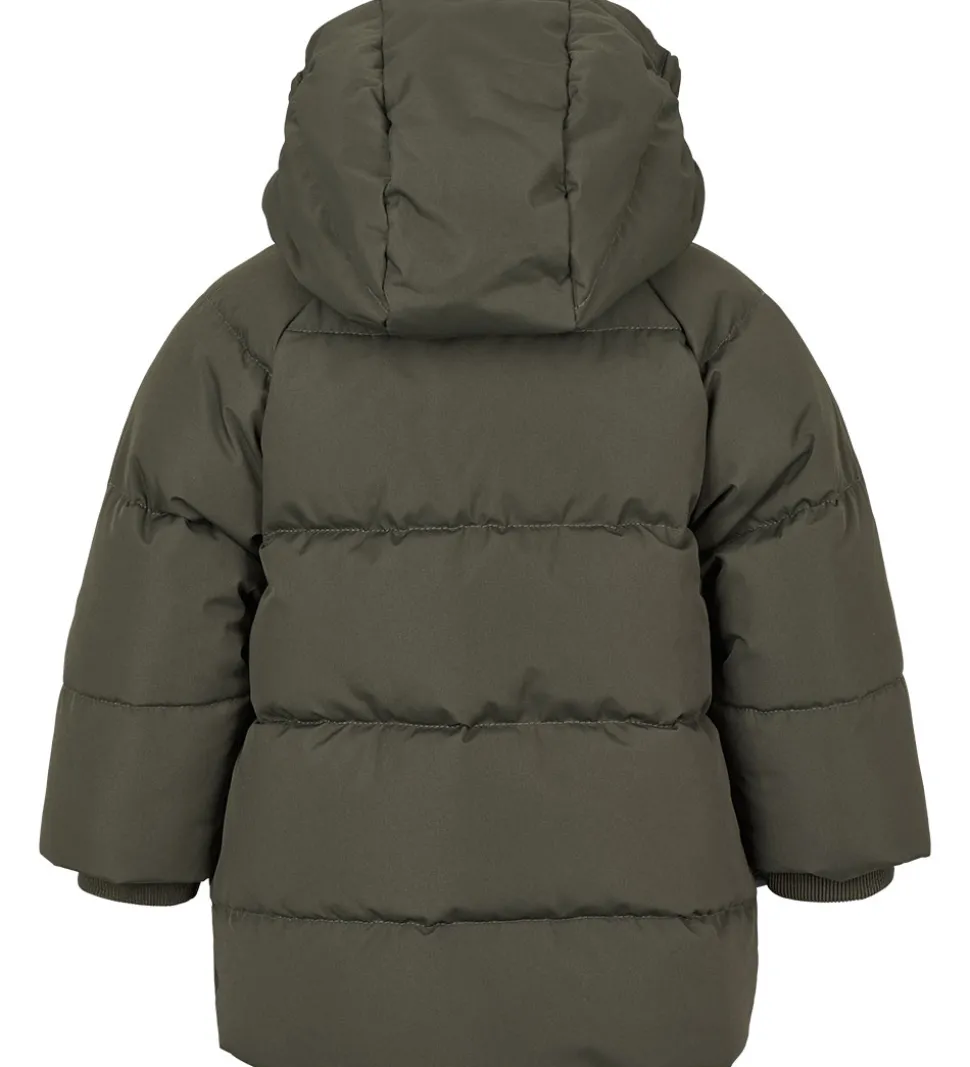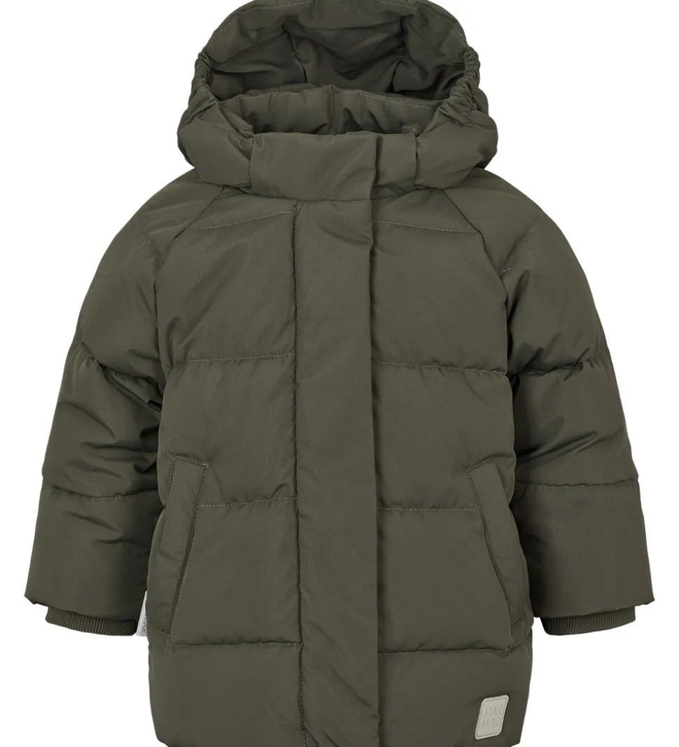 Stilfuld Marmar dunjakke i mørkegrå med grønt skær. Dunjakken har vandrette syninger og et påsyet logo i grå nederst i venstre side.