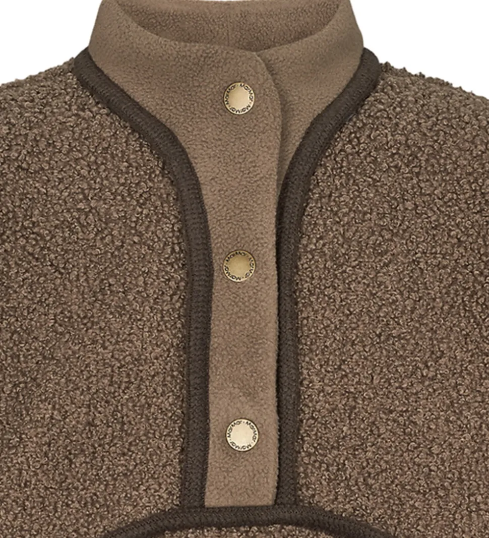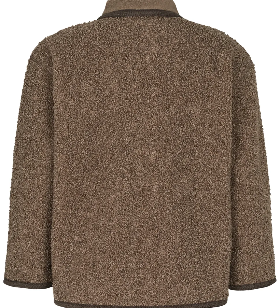 Flot MarMar fleecejakke i brunt teddyfleece og mørkebrune detaljer, og i halsåbningen samt på stolpelukningen er der almindeligt, blødt fleece.