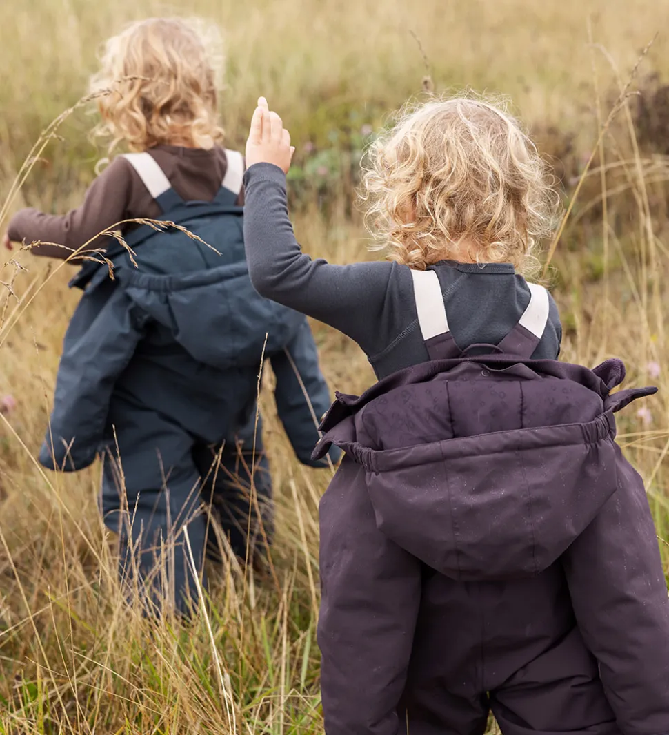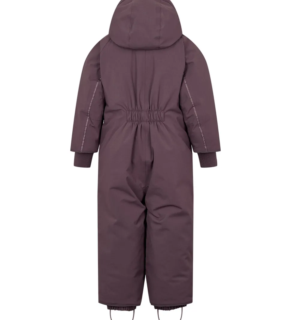 Fin MarMar flyverdragt i mørk lilla med praktiske refleksdetaljer langs ærmerne og benene.