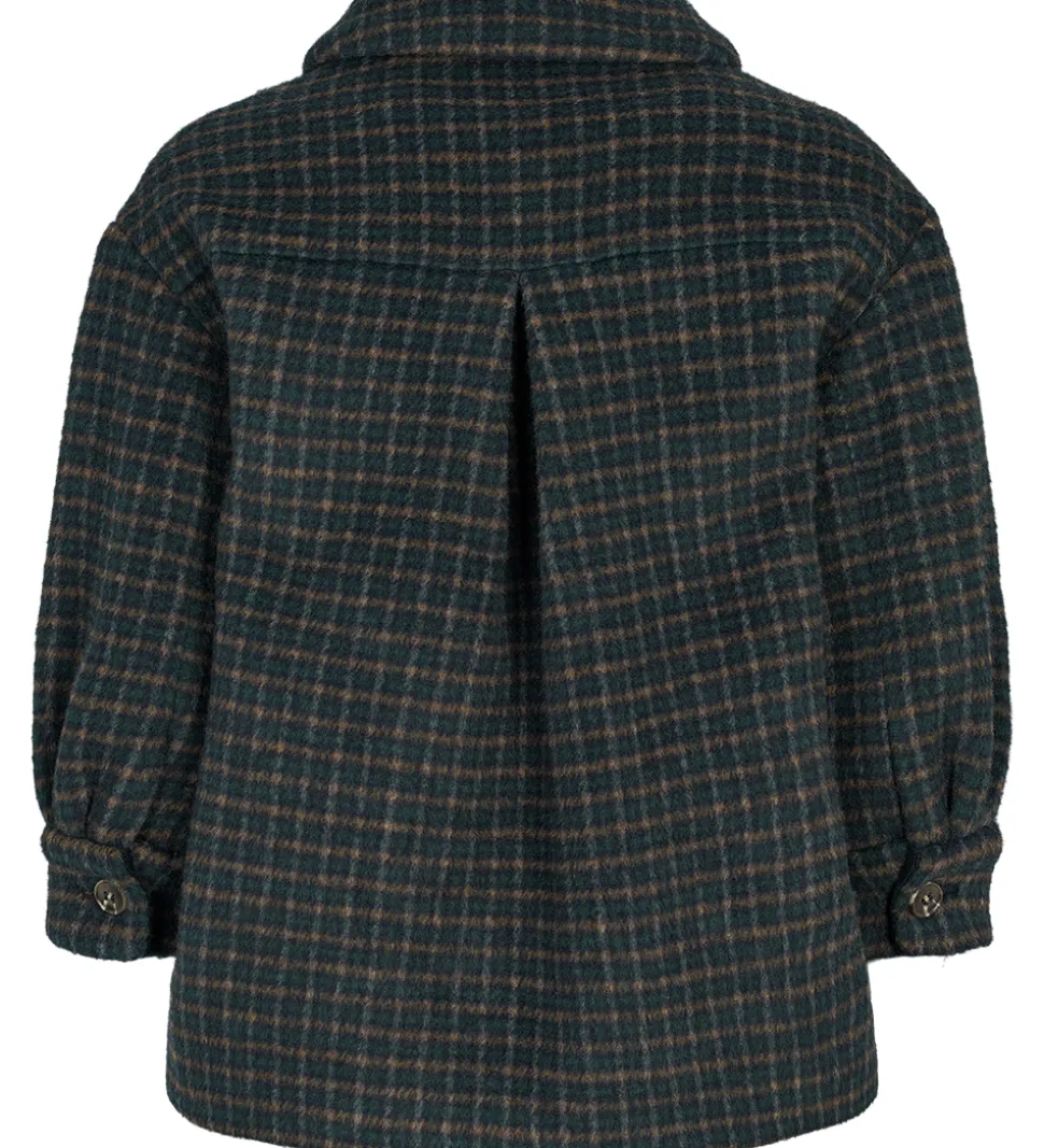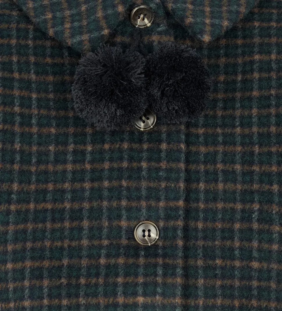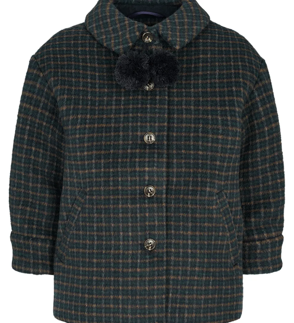 Smuk MarMar frakke med tern i mørke nuancer af navyblå, grøn og brun, og ved kraven er der to fine pomponer i navyblå.