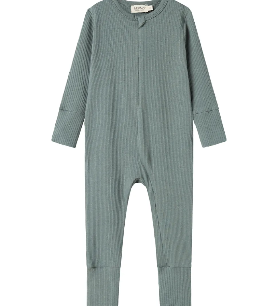 Elegant MarMar heldragt i en stilren, støvet grøn farve. Dragten er lavet af et blødt ribmateriale, hvilket giver et enkelt og tidløst udtryk.