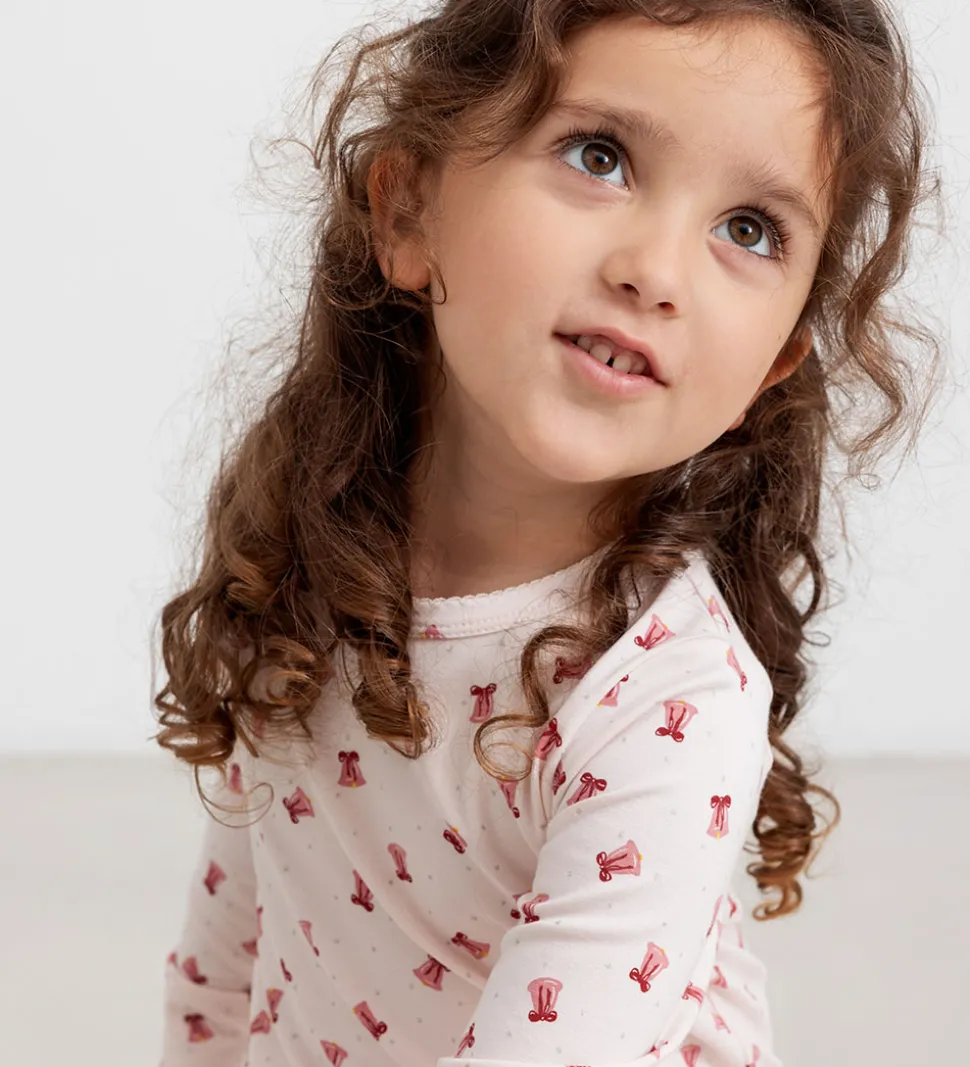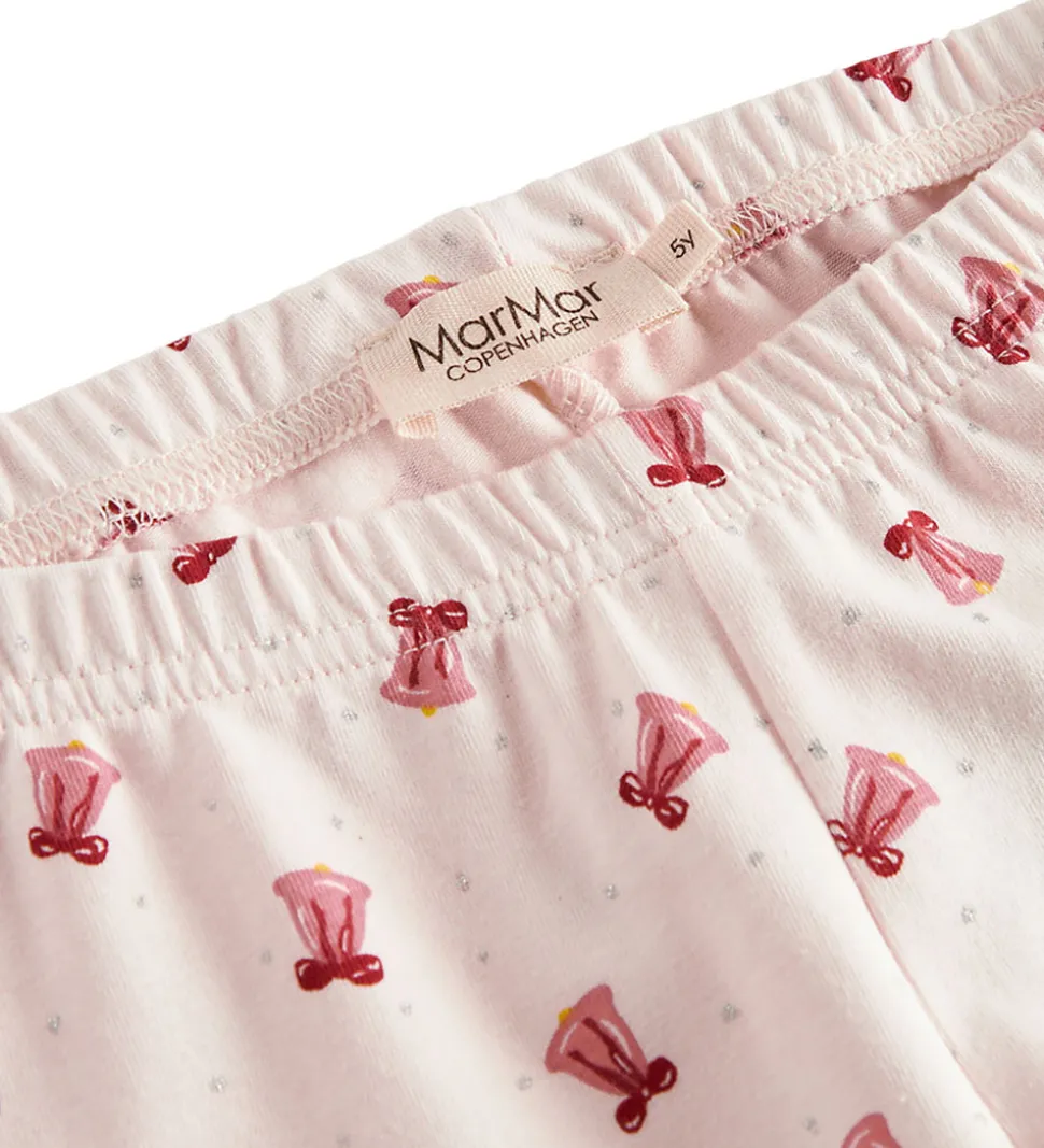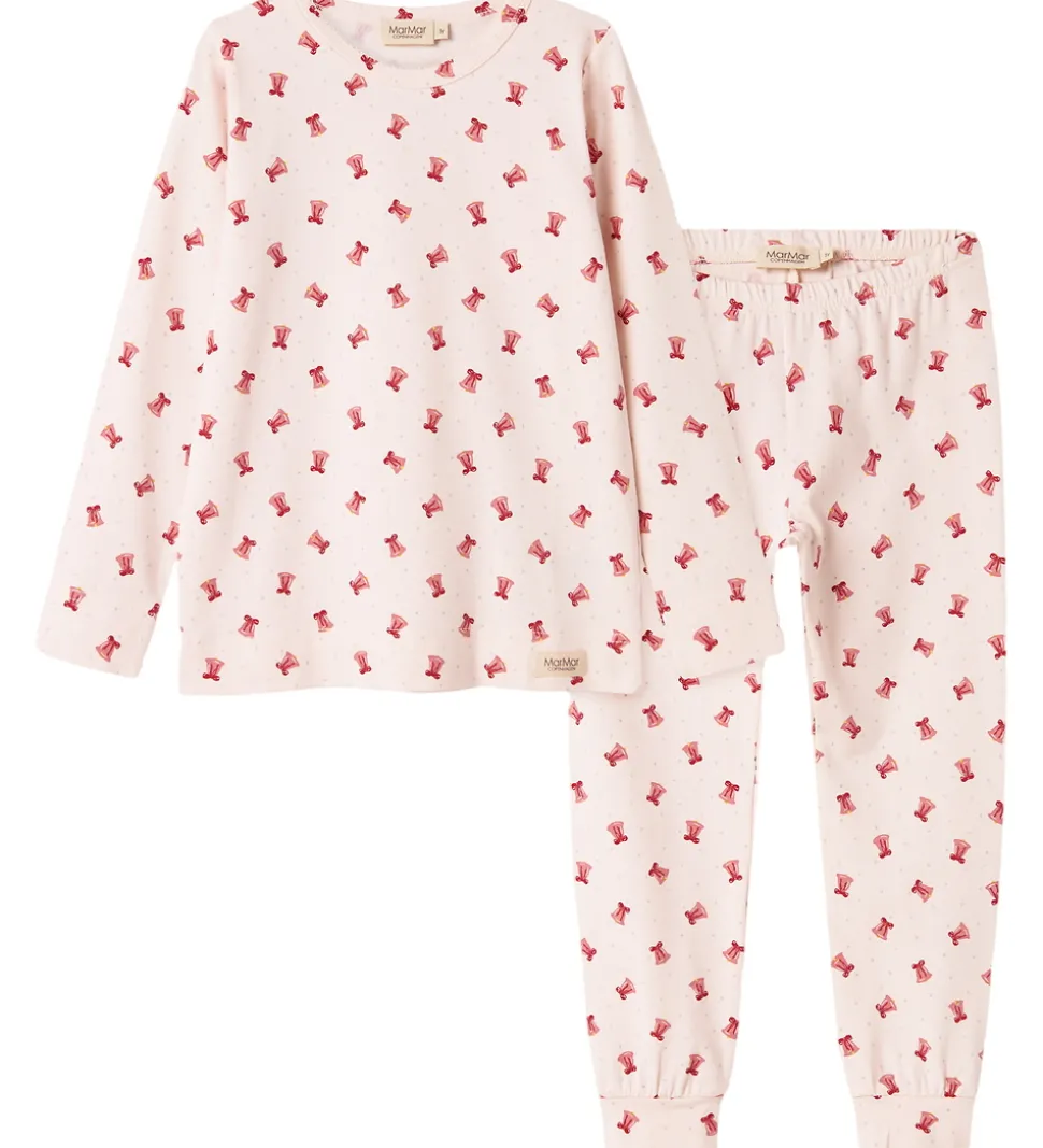 Behageligt MarMar nattøj sæt med lange ærmer i lys rosa. Det har et charmerende mønster af små røde klokker overalt. MarMar nattøjet kombinerer stil og komfort til hyggelige stunder.