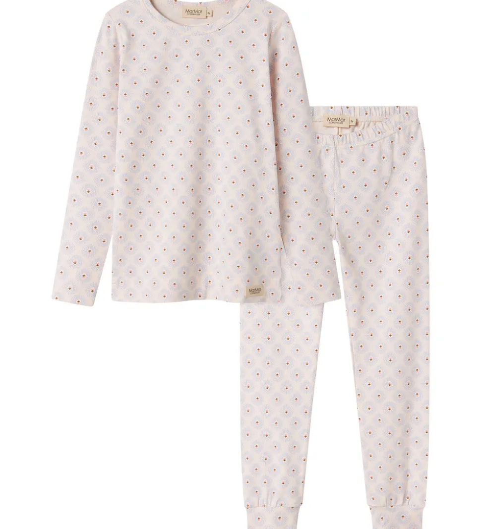 Natblusen er med lange ærmer og en rund halsudskæring. Natbukserne har en praktisk, elastisk talje for god pasform. MarMar sættet er behageligt og perfekt til en god nattesøvn med sin fine detaljering.