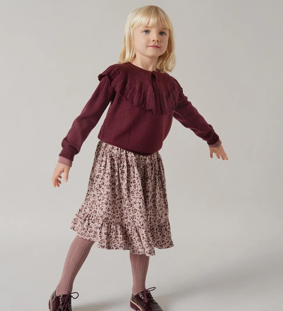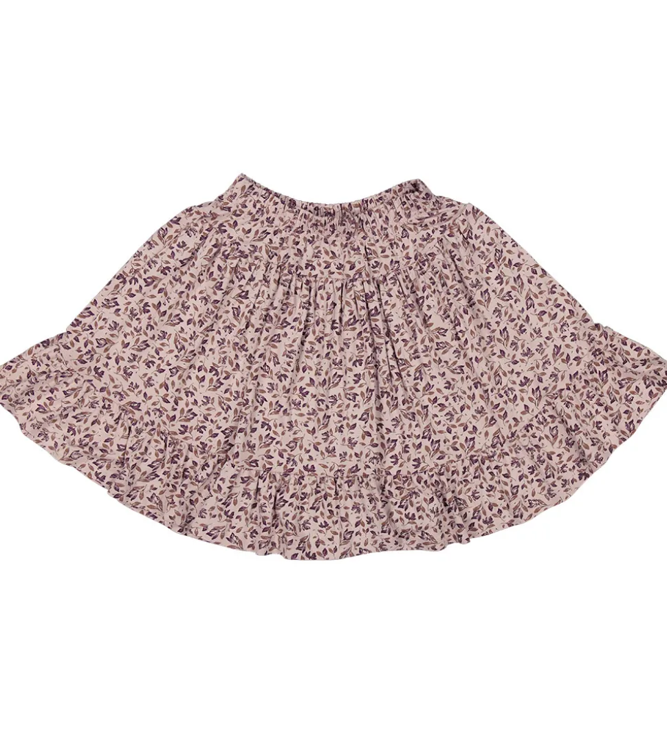 Fin MarMar nederdel i rosa med et blomsterprint i lilla og lysebrune nuancer.