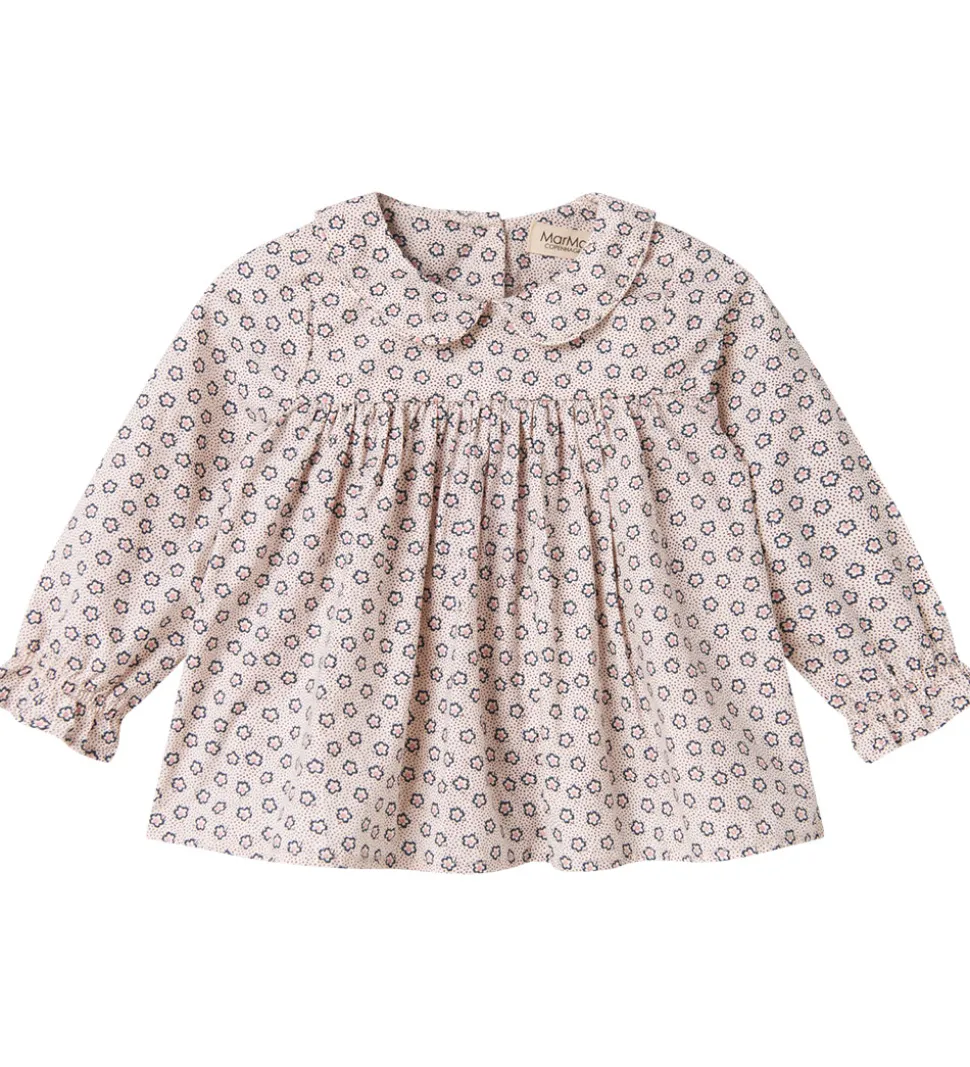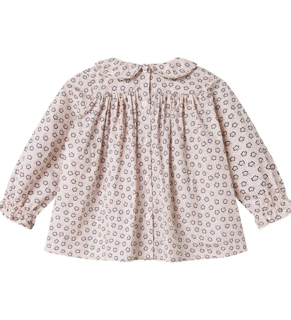 Charmerende MarMar skjorte i cremehvid med lange ærmer, og er pyntet med et delikat blomster- og prikmønster i mørkeblå, brun og rosa.