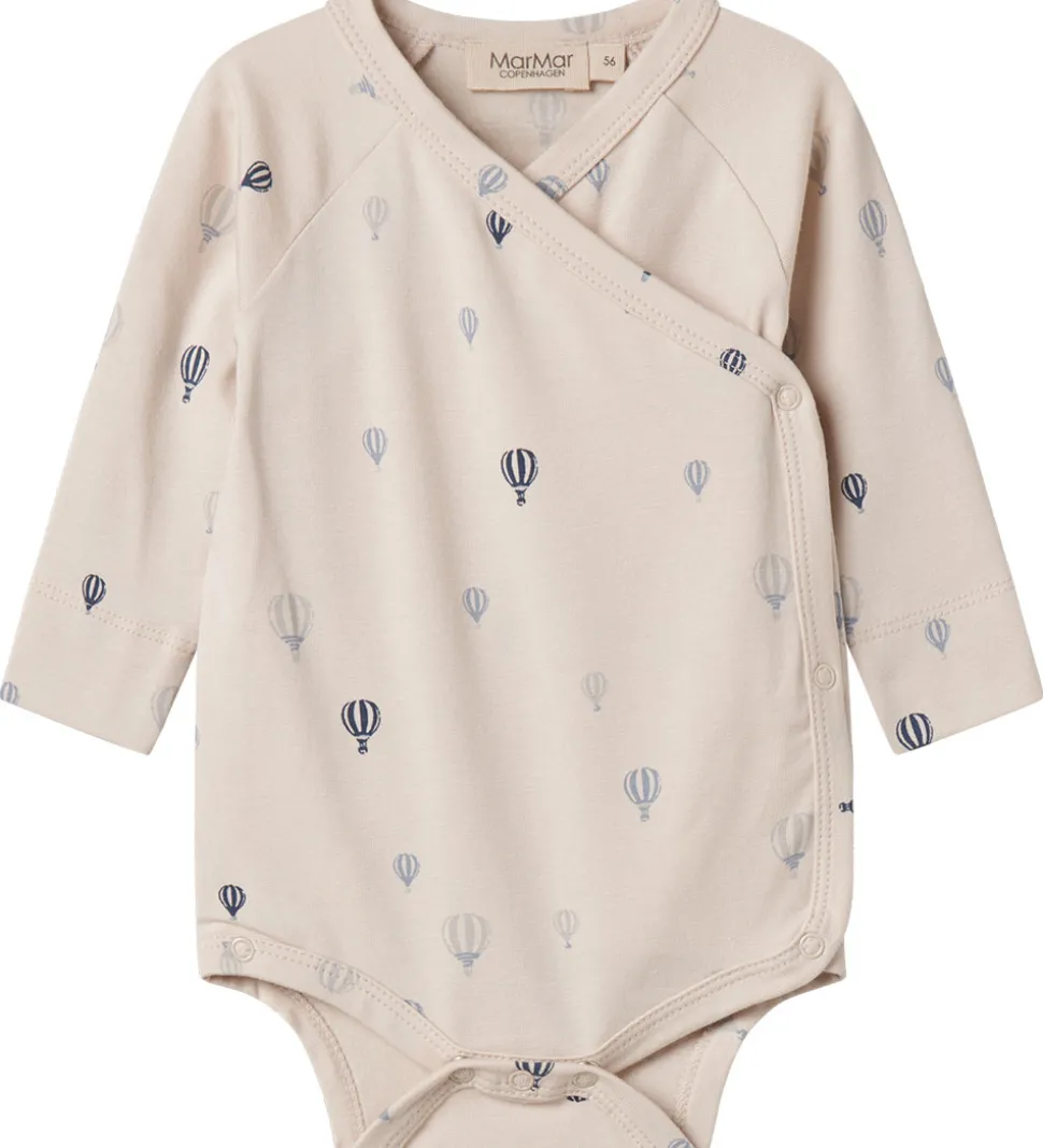 Charmerende MarMar slå-om body i beige dekoreret med et subtilt ballonprint i blå nuancer.