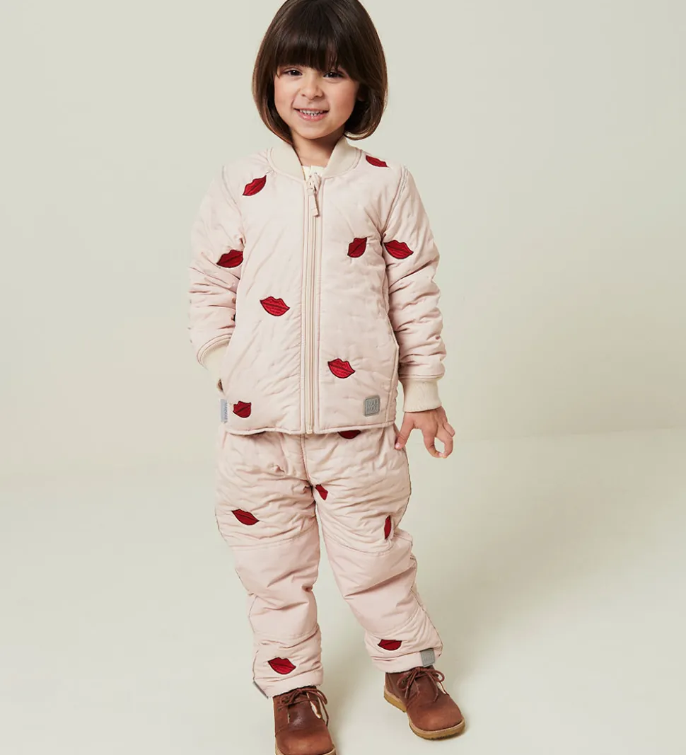 Skønne MarMar termobukser i beige med broderede, røde kyssemunde. Termobukserne har en quiltet struktur af små, indprægede prikker.
