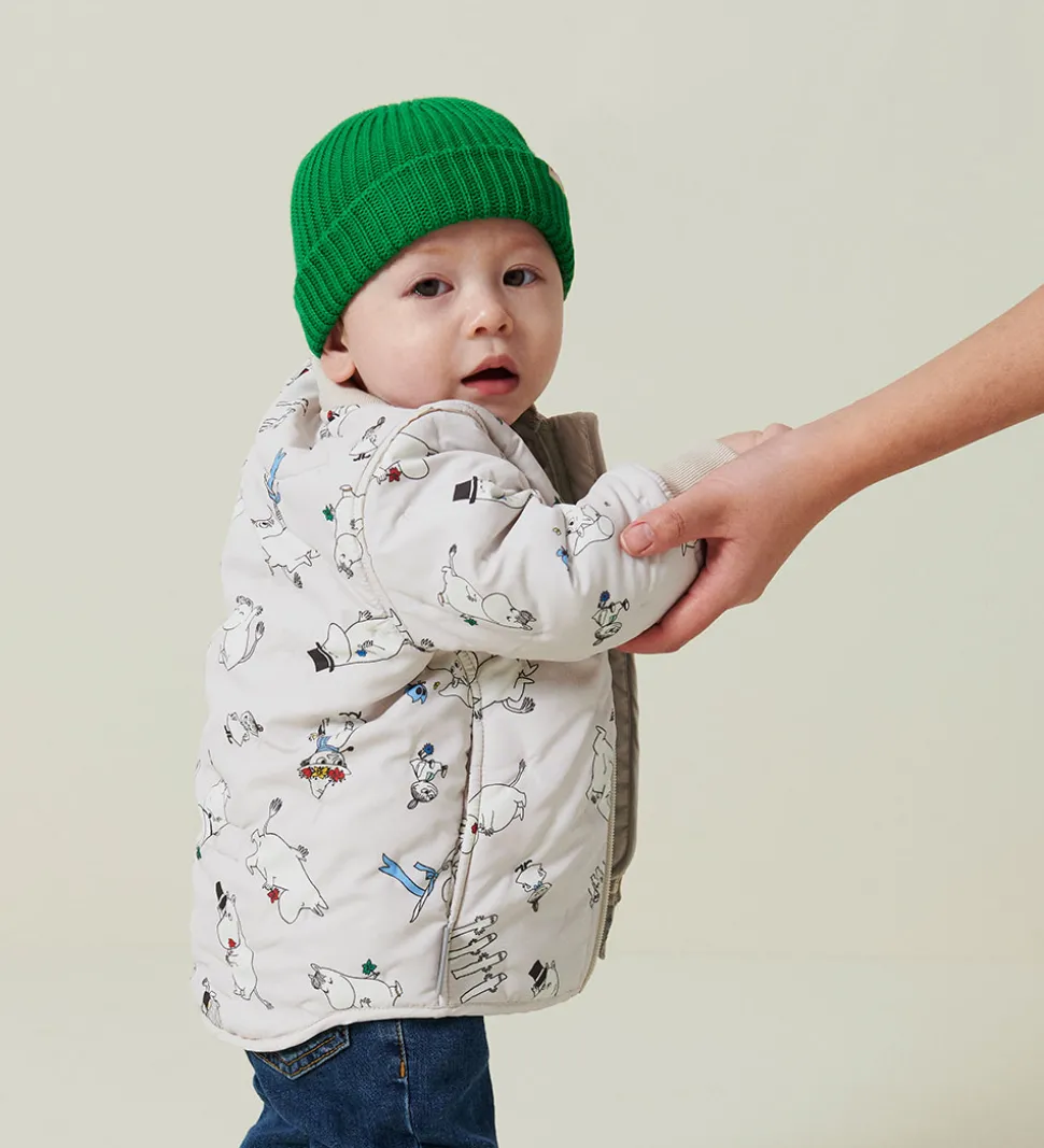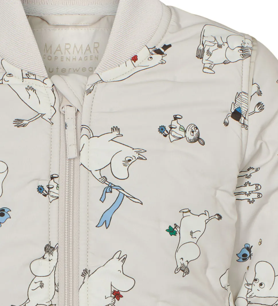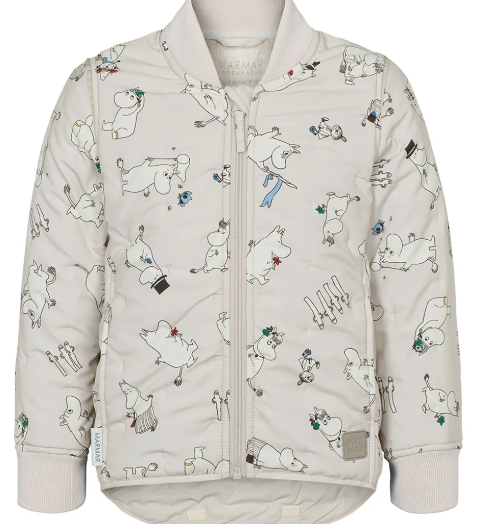 Skøn MarMar termojakke i lys beige med alloverprint med de søde Mumitrolde og motiver fra Mumidalen. Termojakken har en quiltet struktur af små, indprægede prikker.