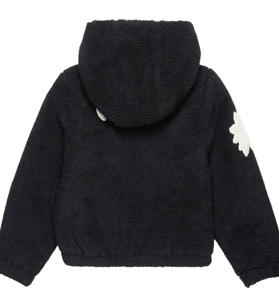 Lækker Marni fleecejakke i sort teddyfleece, og fortil og på ærmerne sidder der store, hvide snefnug. På ryggen står der “Marni” med store, hvide bogstaver.
