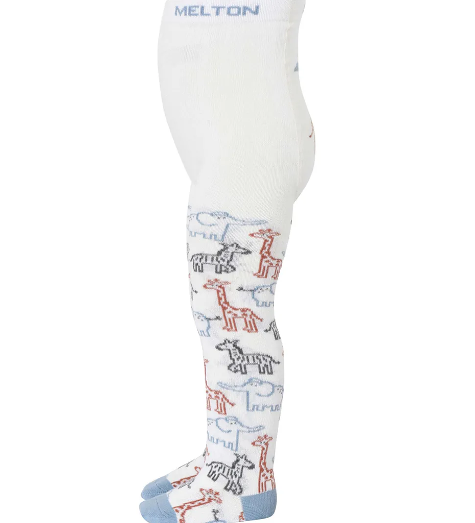 Skønne Melton strømpebukser i hvid med et print på benene af elefanter, giraffer og zebraer i blå, brun og grå. Strømpebukserne har en støvet blå hæl og tæer.