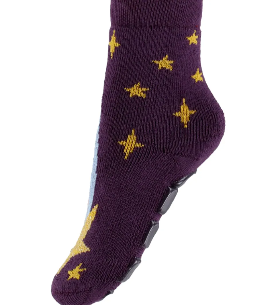 Fine Melton strømper i lilla med et stort stjerneskud i rosa, orange og lyseblå og med en stjerne i gul med guldglimmer.