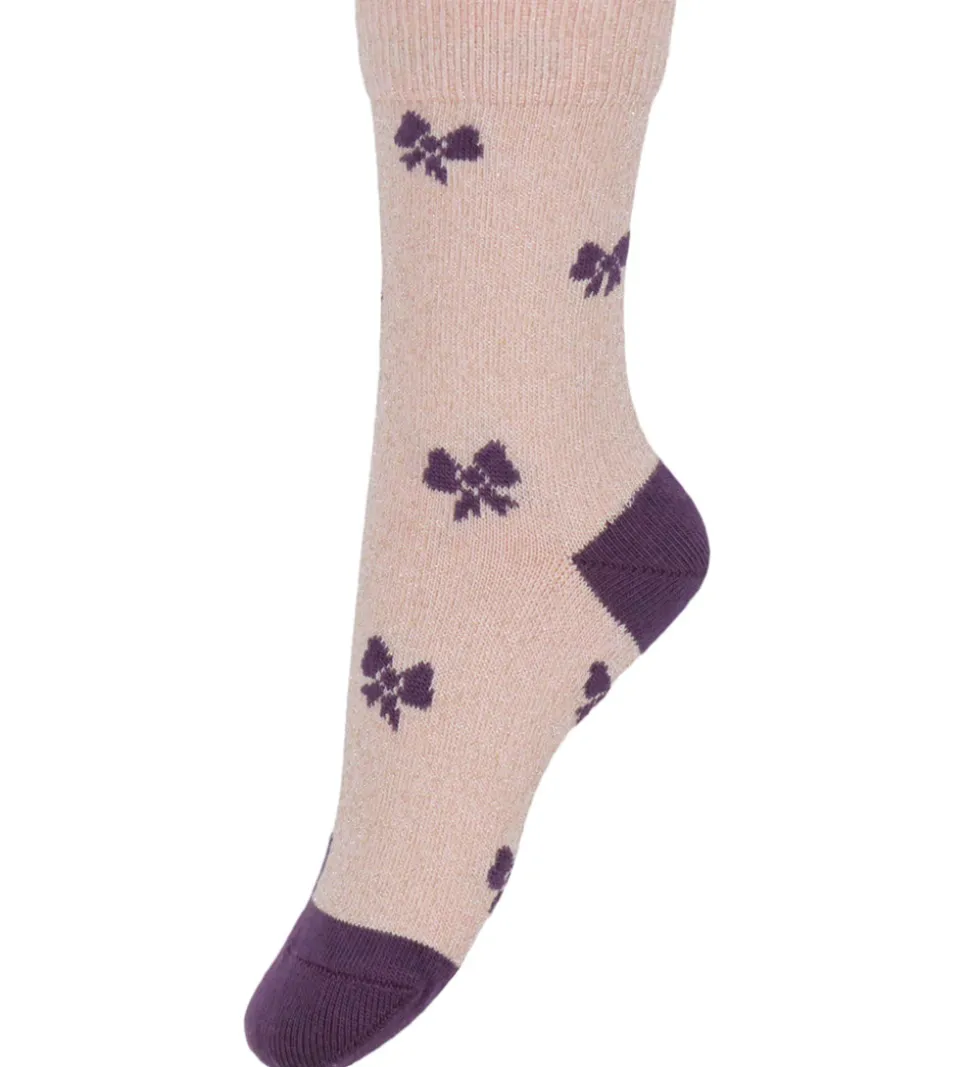 Elegante Melton strømper i rosa med glimmer og lilla sløjfer samt lilla hæl og tå. Strømperne har et almindeligt længde skaft med en bred ribkant.