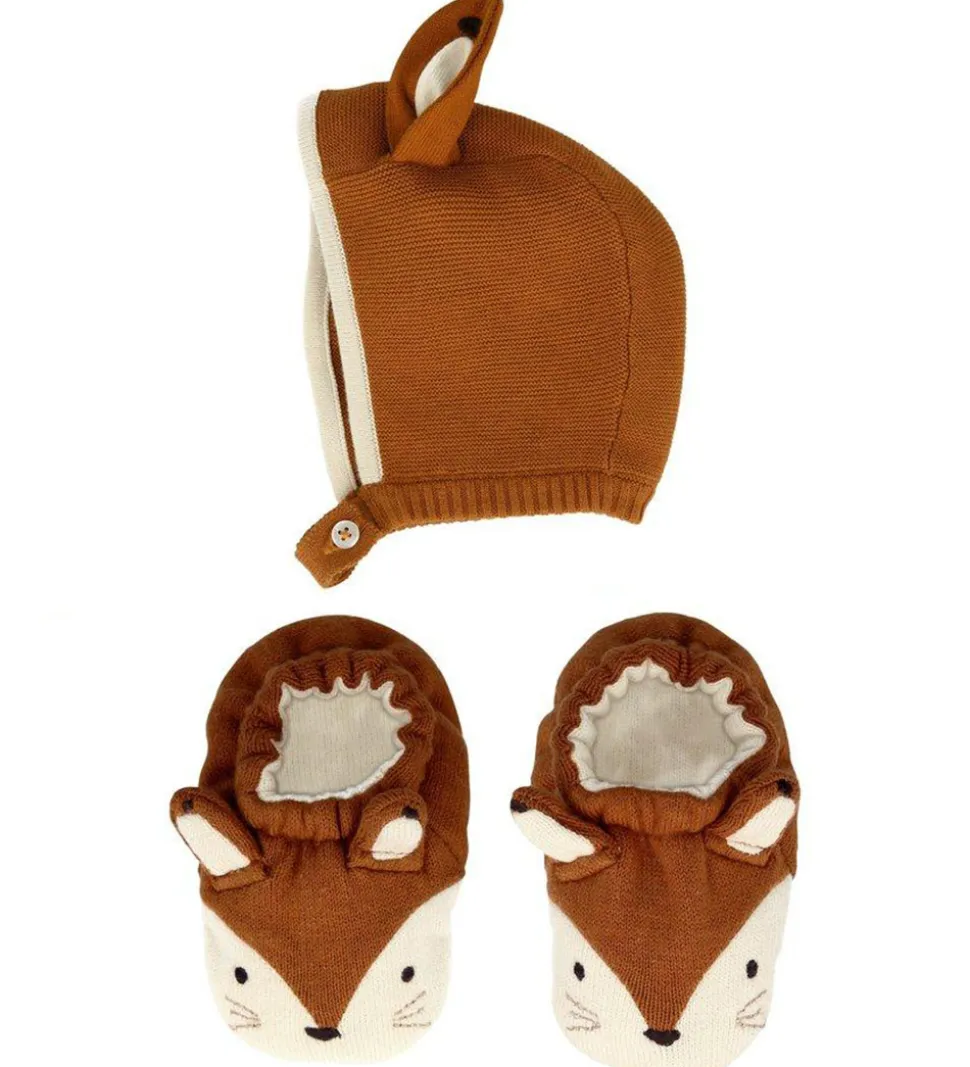 Fint Meri Meri sæt bestående af et par futter og en babyhjelm. Sættet er i en strikket kvalitet i brun og hvid.
