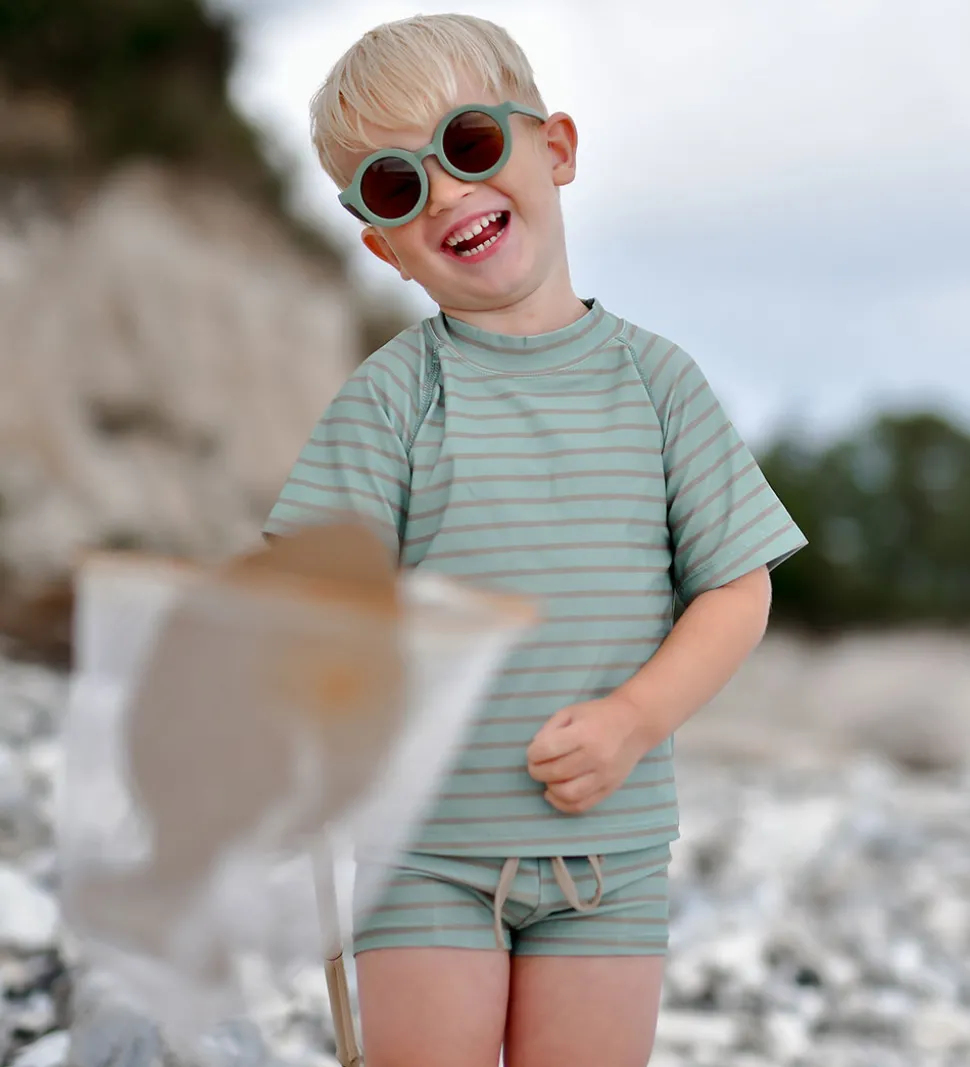 Smart Mikk-Line badetøj i en flot grøn med brune striber. Mikk-Line badetøjet har en behagelig pasform med justerbar snøre i taljen, der sikrer god komfort og holdbarhed.