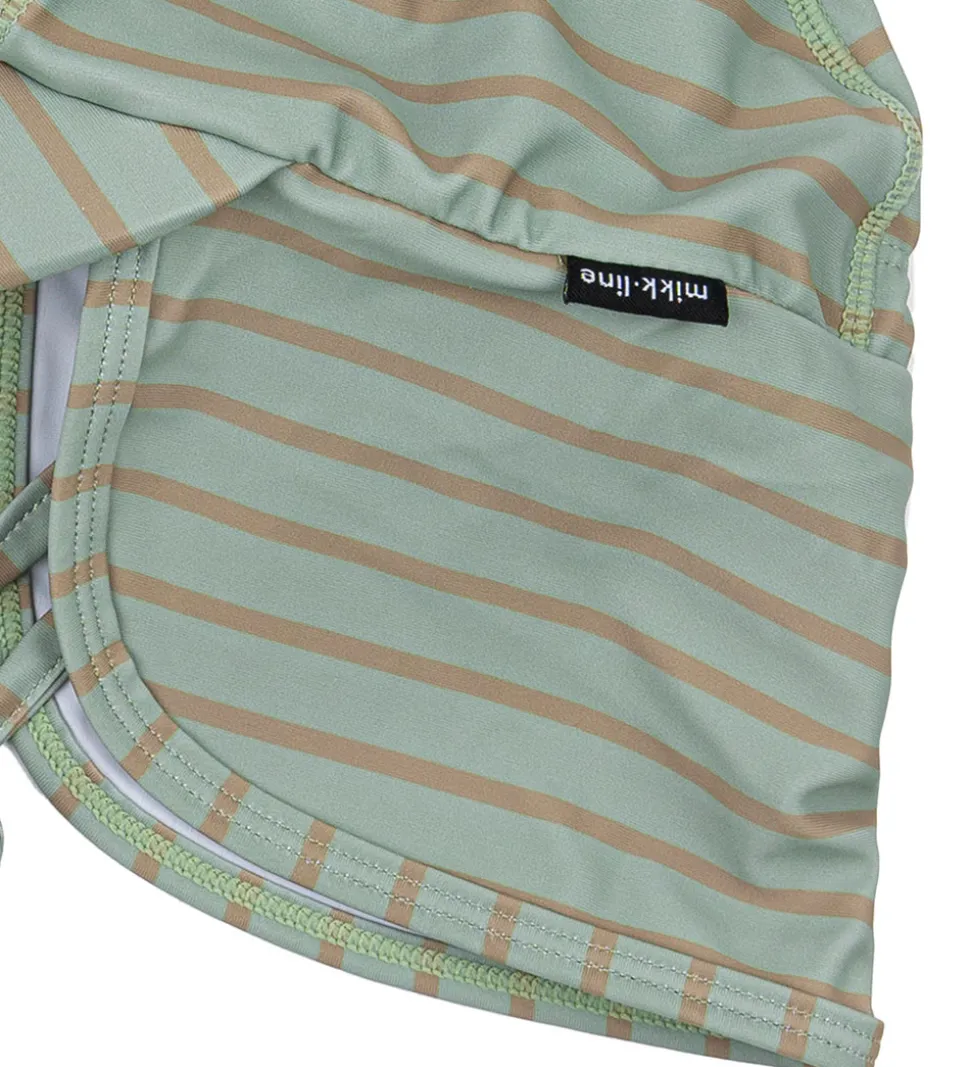 Flot Mikk-Line badehat i en lysegrøn nuance med brune striber. Mikk-Line badehatten har praktiske snore til justering og giver god beskyttelse til hovedet. Perfekt til solrige dage ved vandet.