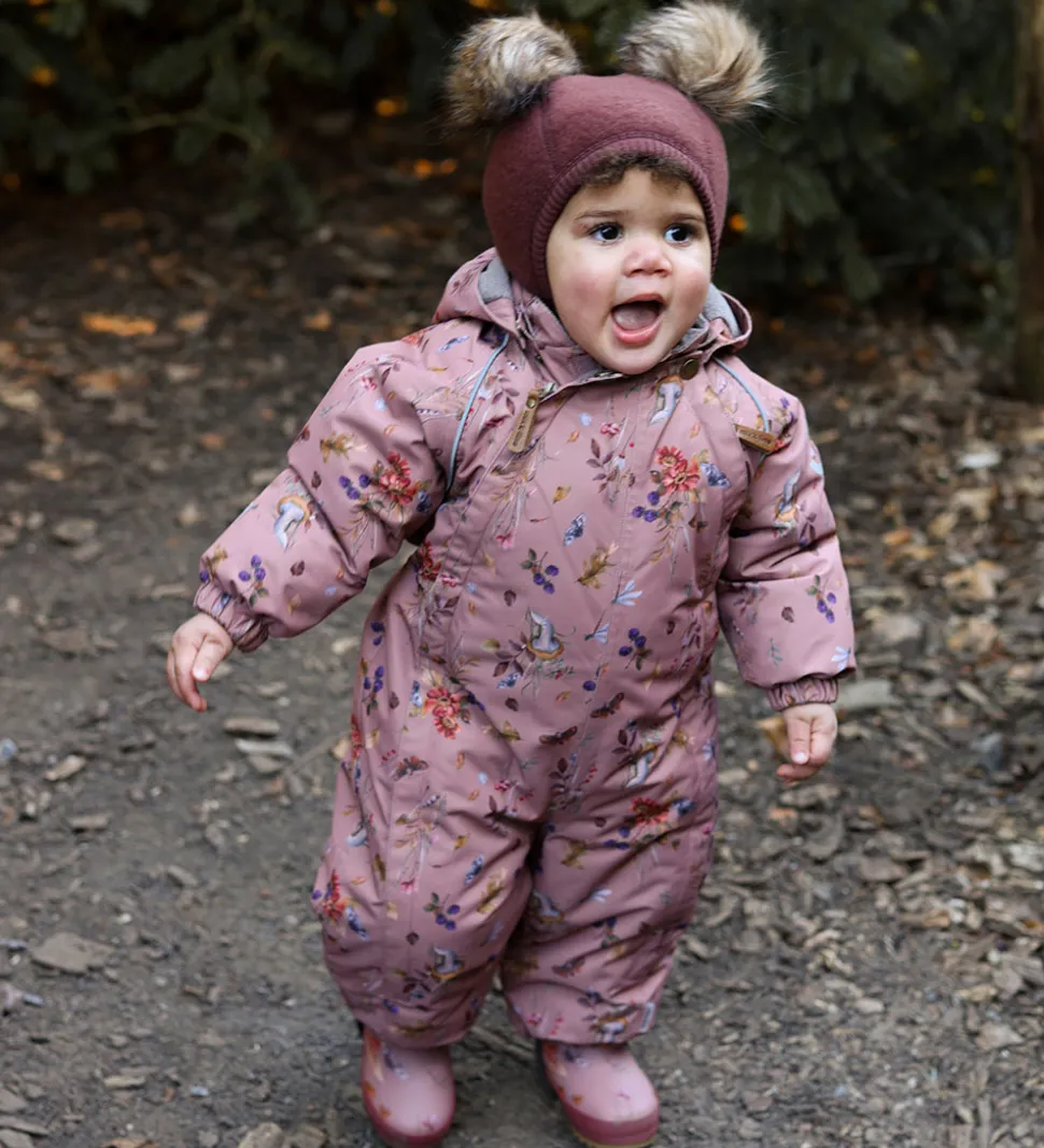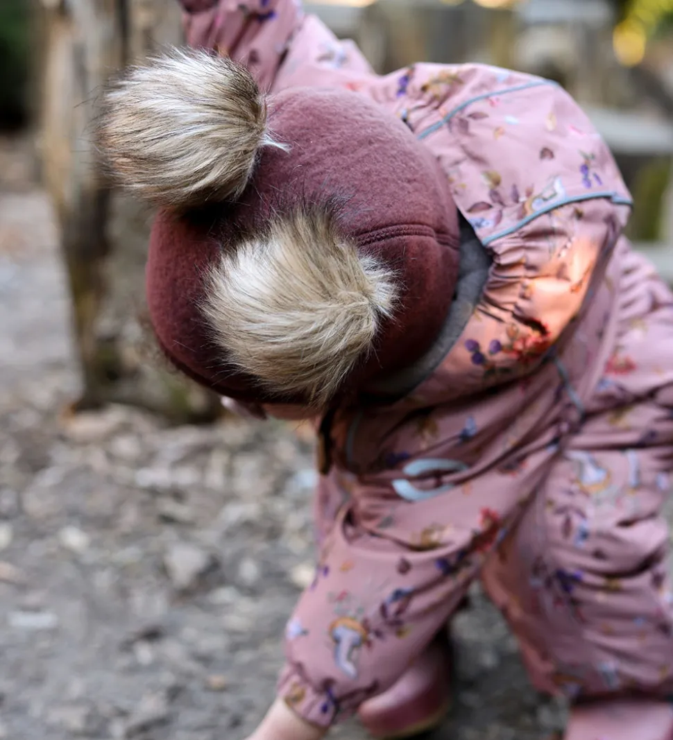 Pæn Mikk-Line elefanthue af filtet merinould i mørkerød. Elefanthuen har nuttede, brune kvaste på toppen, som kan tages af ved hjælp af trykknapper. Under hagen er der et brunt lædermærke med et Mikk-Line-logo.