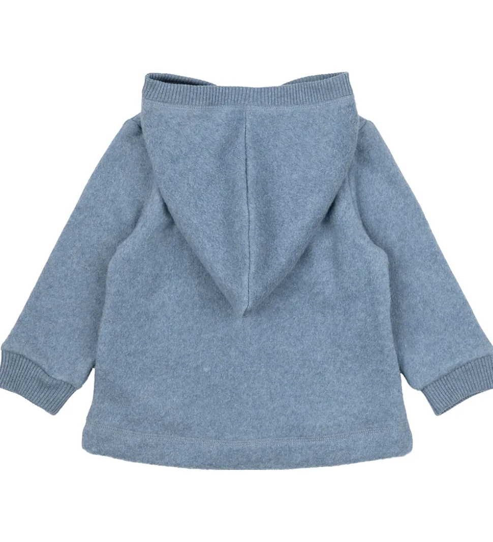 Lækker Mikk-Line fleecetrøje i en skøn blå farve med gennemgående brune knapper fortil. Fleecetrøjen har en blød, spids hætte og lange ærmer. Den har ribkanter i åbningen fortil samt i ærmerne. Fleecetrøjen har en lomme i hver side og er fremstillet i en meget blød og lun kvalitet.