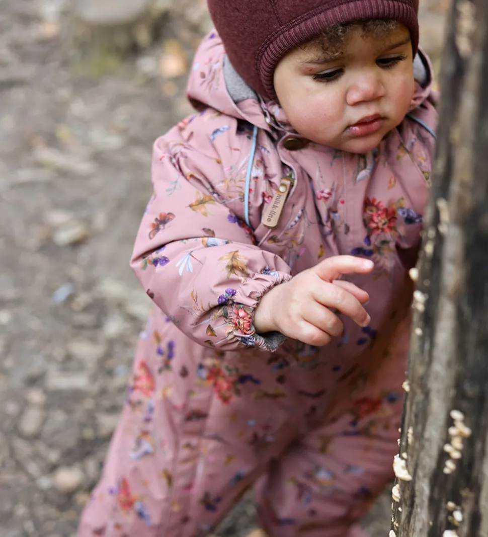 Fin Mikk-Line flyverdragt i rosa med et smukt blomsterprint. Flyverdragten har refleksdetaljer langs skuldrene, på venstre ærmer og på hætten.