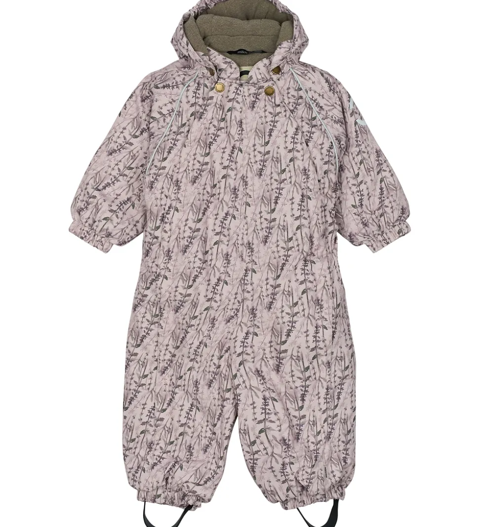 Fin Mikk-Line flyverdragt i støvet rosa med et delikat blomstret mønster. Flyverdragten har refleksdetaljer langs skuldrene, på venstre ærmer og på hætten.