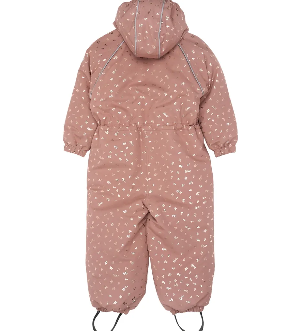 Fin Mikk-Line flyverdragt i rosa med metallisk print af blade i guldb . Flyverdragten har refleksdetaljer langs skuldrene, på venstre ærmer og på hætten.