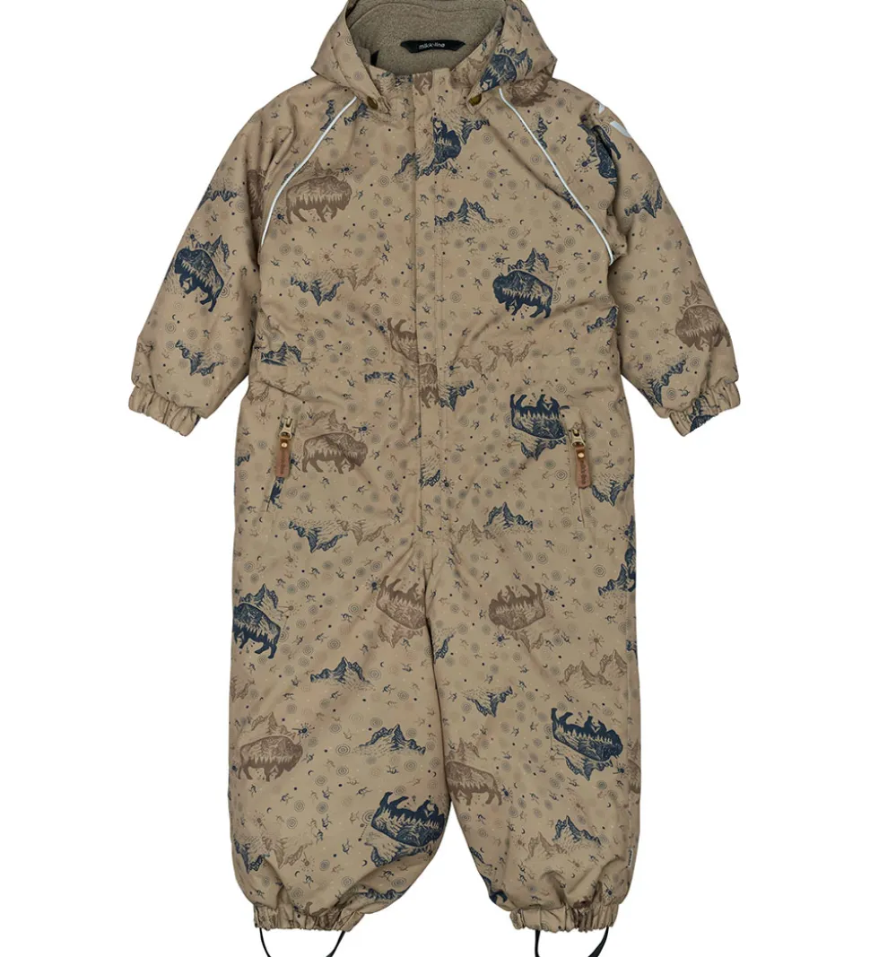 Fin Mikk-Line flyverdragt i støvetgrøn med et alloverprint med bl.a. bisonokser og klippeformationer brune og blå farver. Flyverdragten har refleksdetaljer langs skuldrene, på venstre ærmer og på hætten.