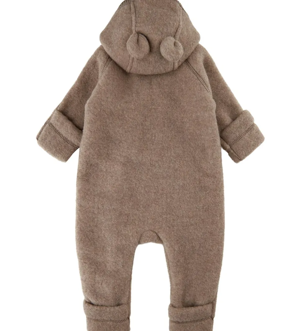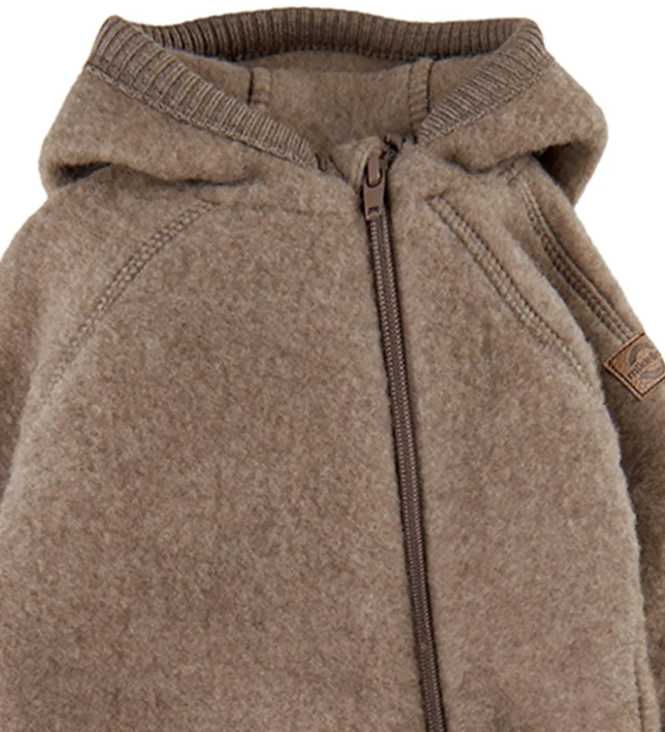Skøn Mikk-Line køredragt af filtet uld i meleret lysebrun. Øverst på venstre ærme er der et brunt lædermærke med et Mikk-Line-logo.